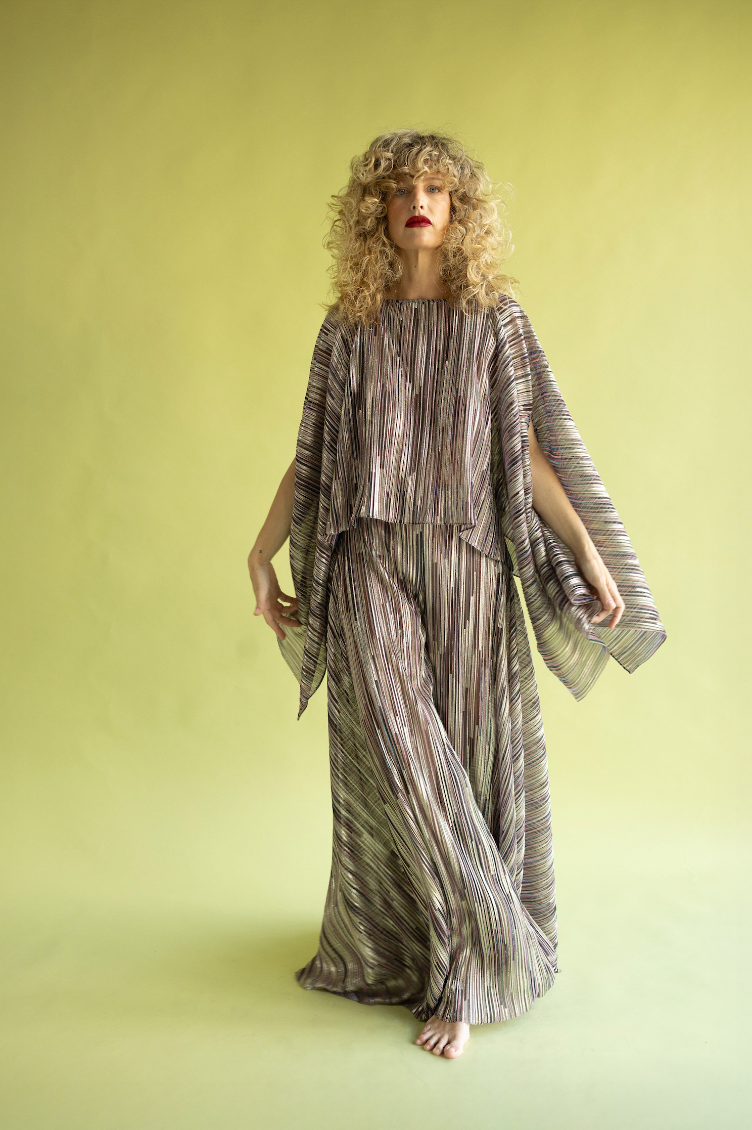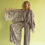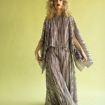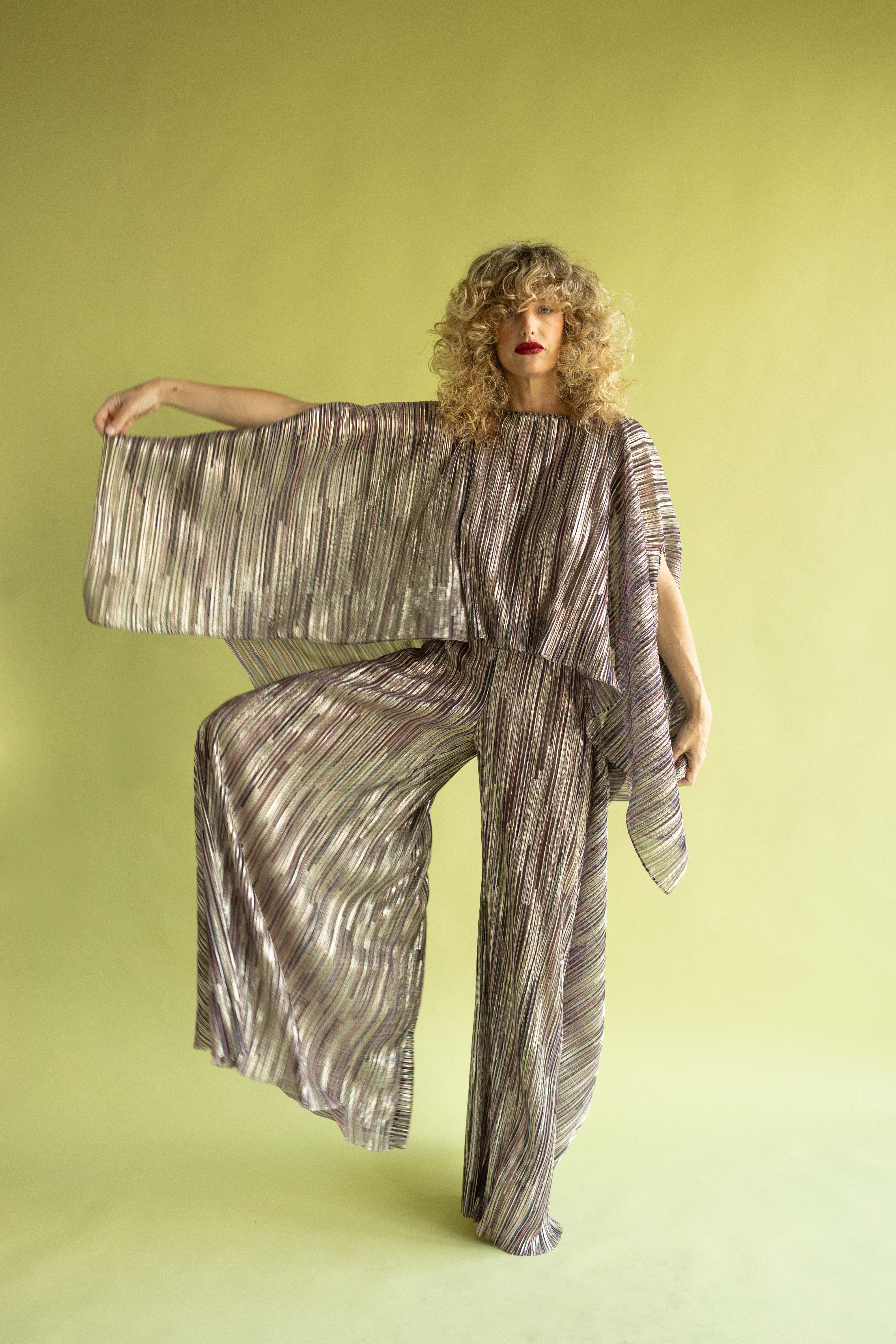 Top de silueta tipo capa con cuello barco y manga ancha. Confeccionado en nuestro tejido de punto plisado con lúrex, tiene brillo y una caída fluida. Es una pieza con volumen y movimiento. El diseño es arquitectónico y a la vez, comodísimo de llevar.