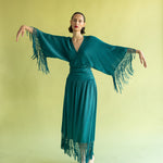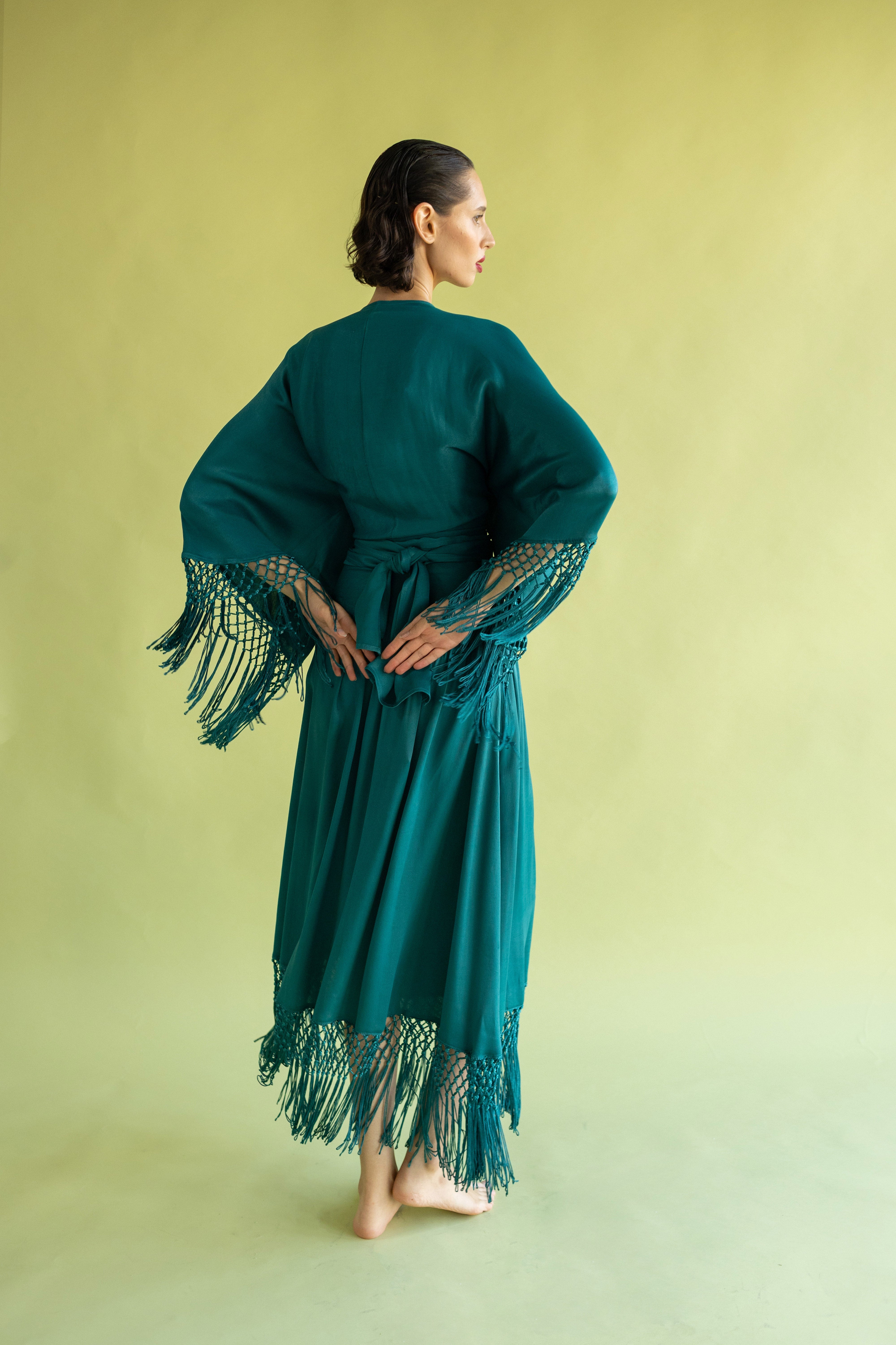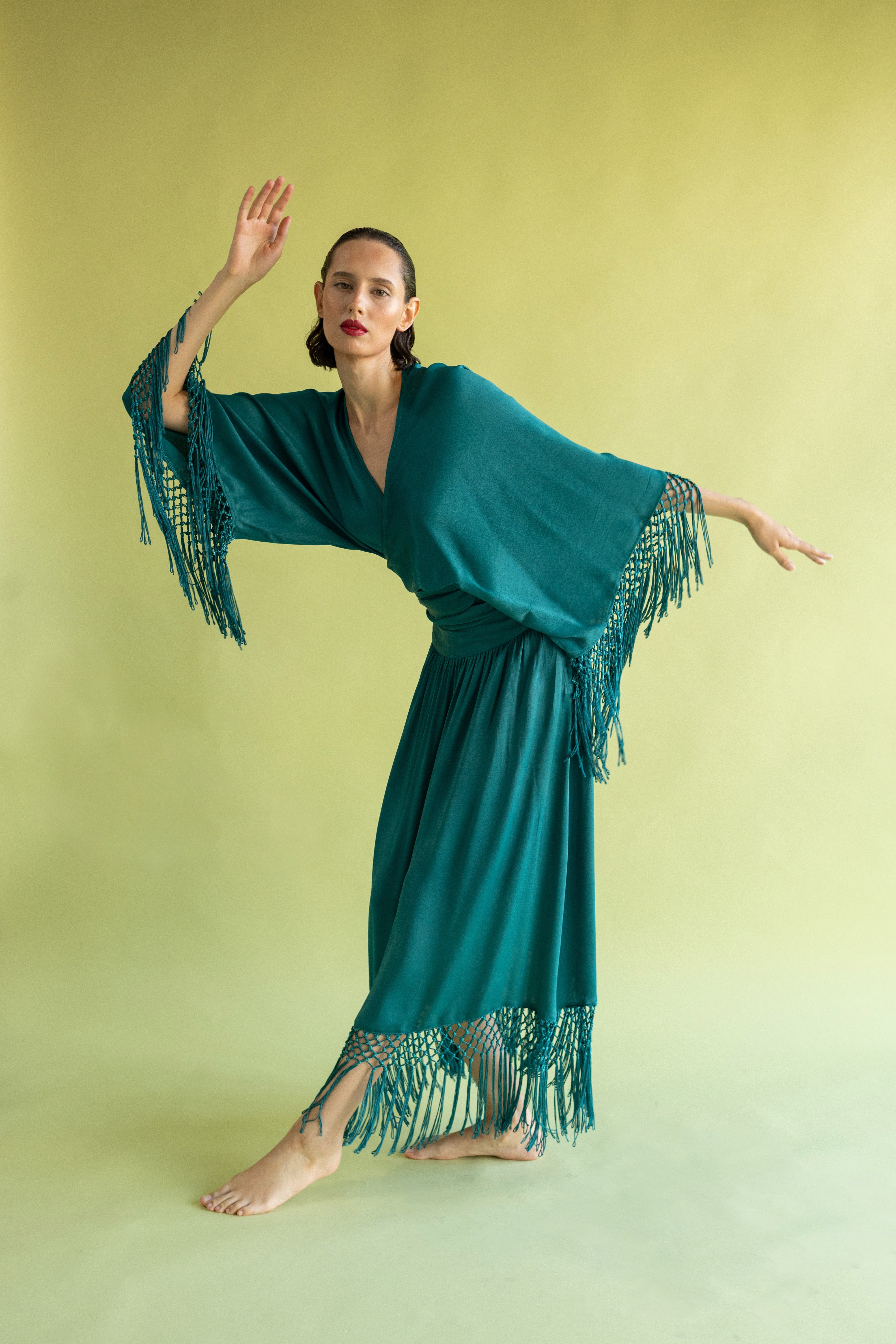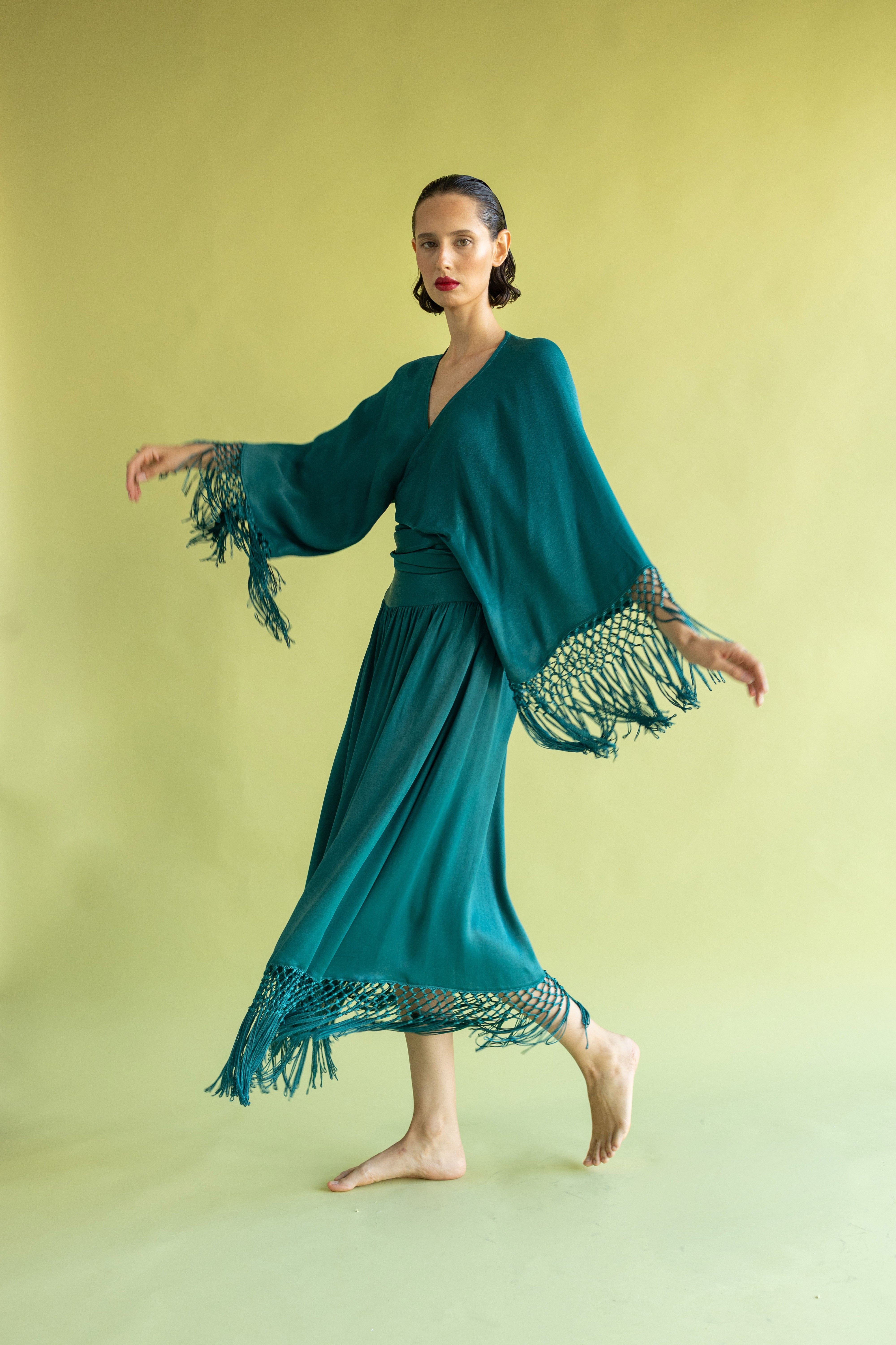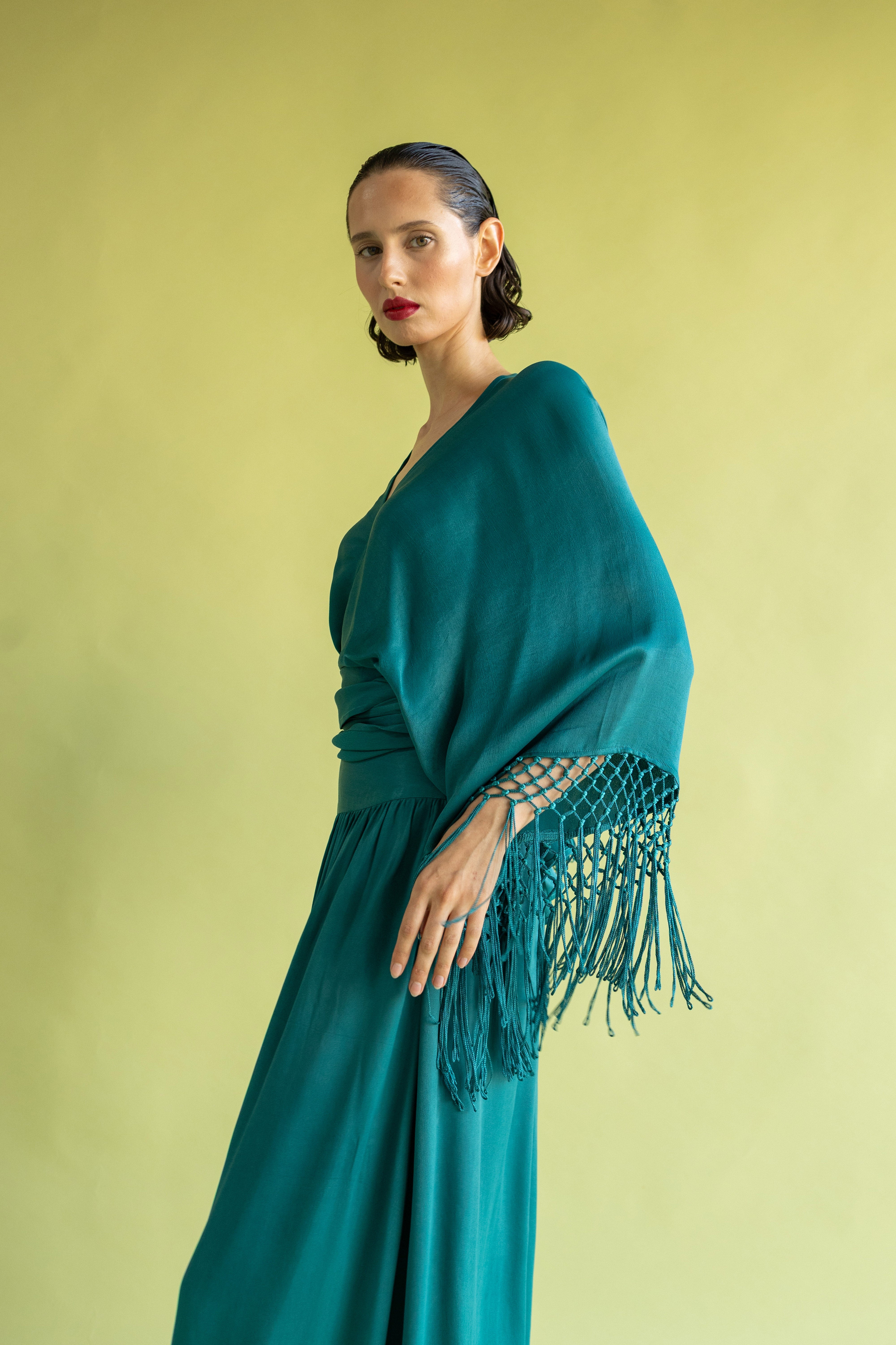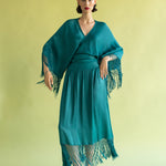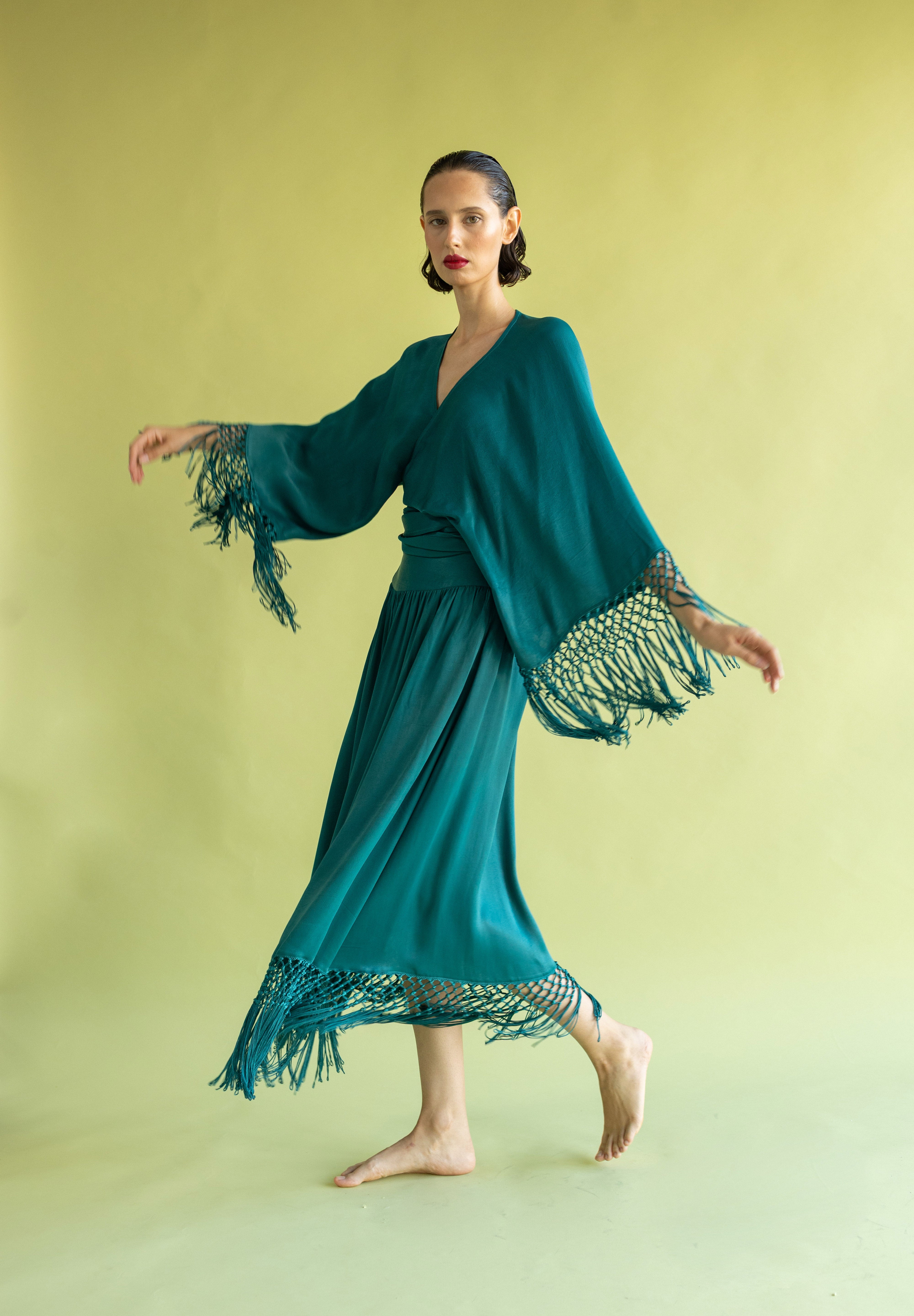 Falda larga de talle alto con cintura gruesa. Confeccionada en Crep Satén, su tejido ligero aporta un movimiento al caminar. La pieza está protagonizada por una ancha cenefa de flecos que remata el bajo, aportando un toque artesanal único. Una falda que es pura sofisticación bohemia, diseñada para no pasar desapercibida.