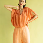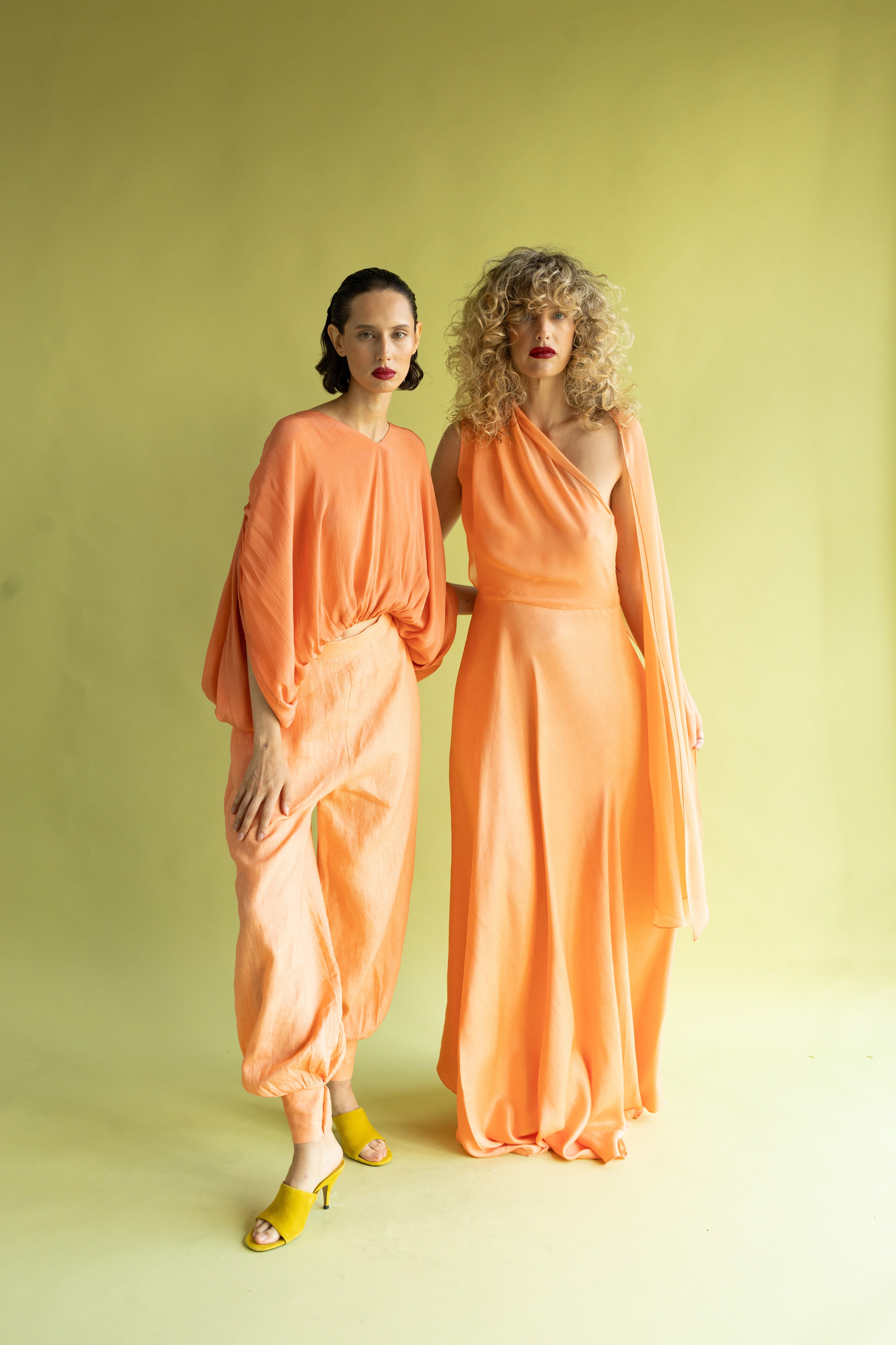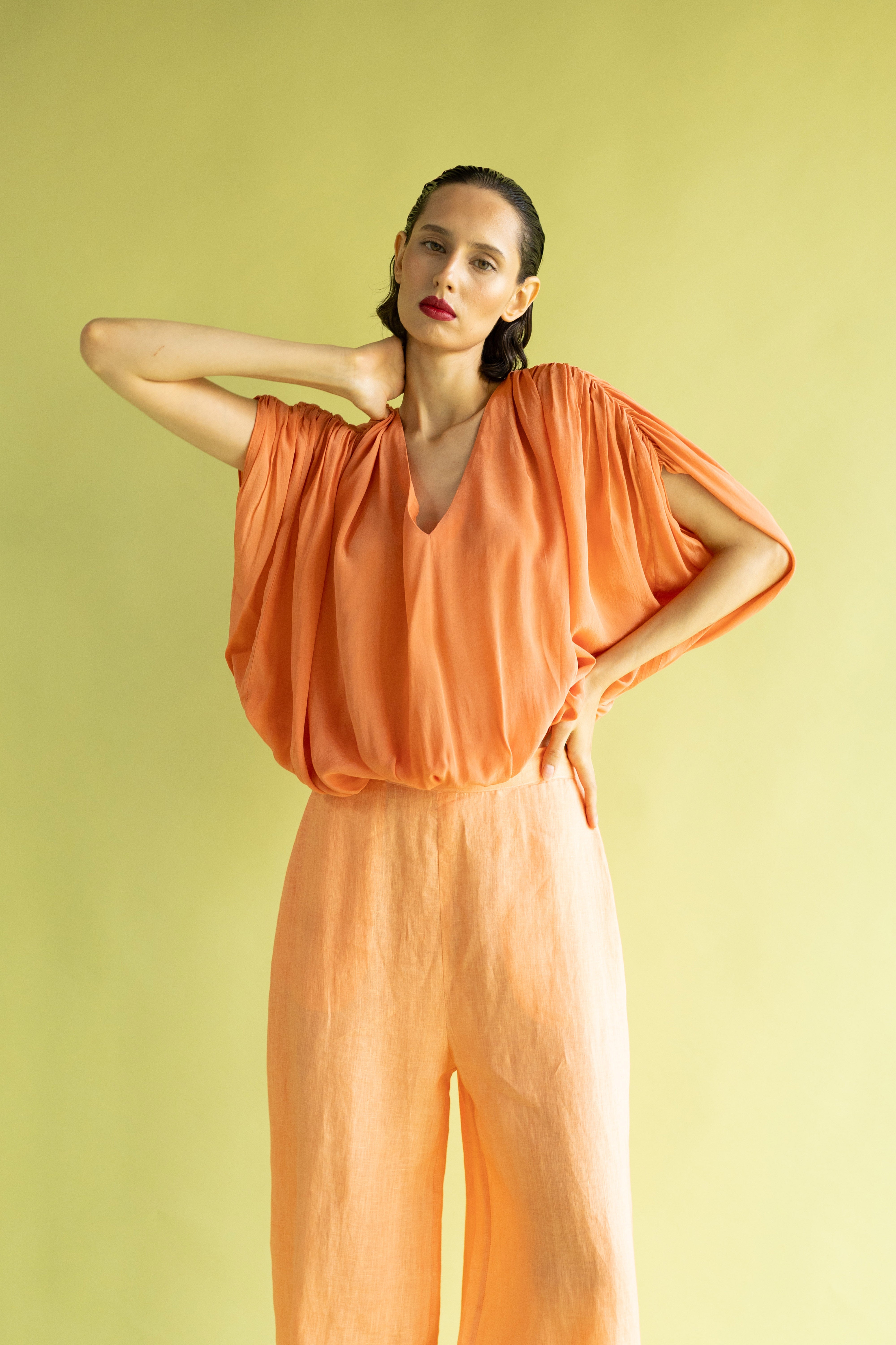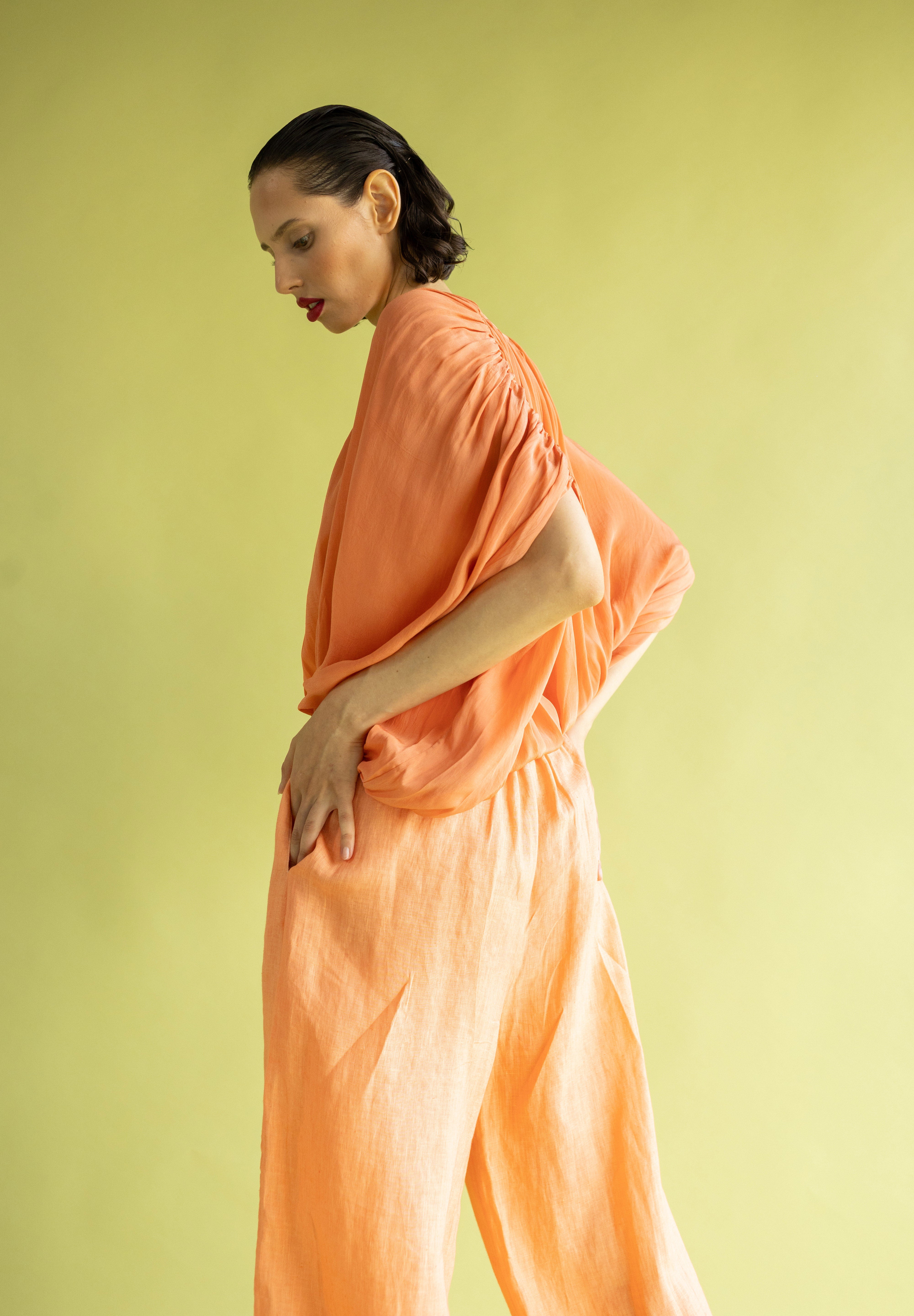 Pantalón de talle alto confeccionado en lino, un tejido noble que aporta cuerpo y una textura natural. Su diseño se distingue por el volumen holgado en la pierna que se estrecha en el tobillo mediante un puño. Una pieza de líneas limpias que equilibra frescura y sofisticación, ideal para un estilo urbano relajado con un toque artesanal.