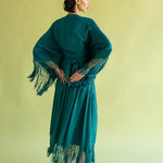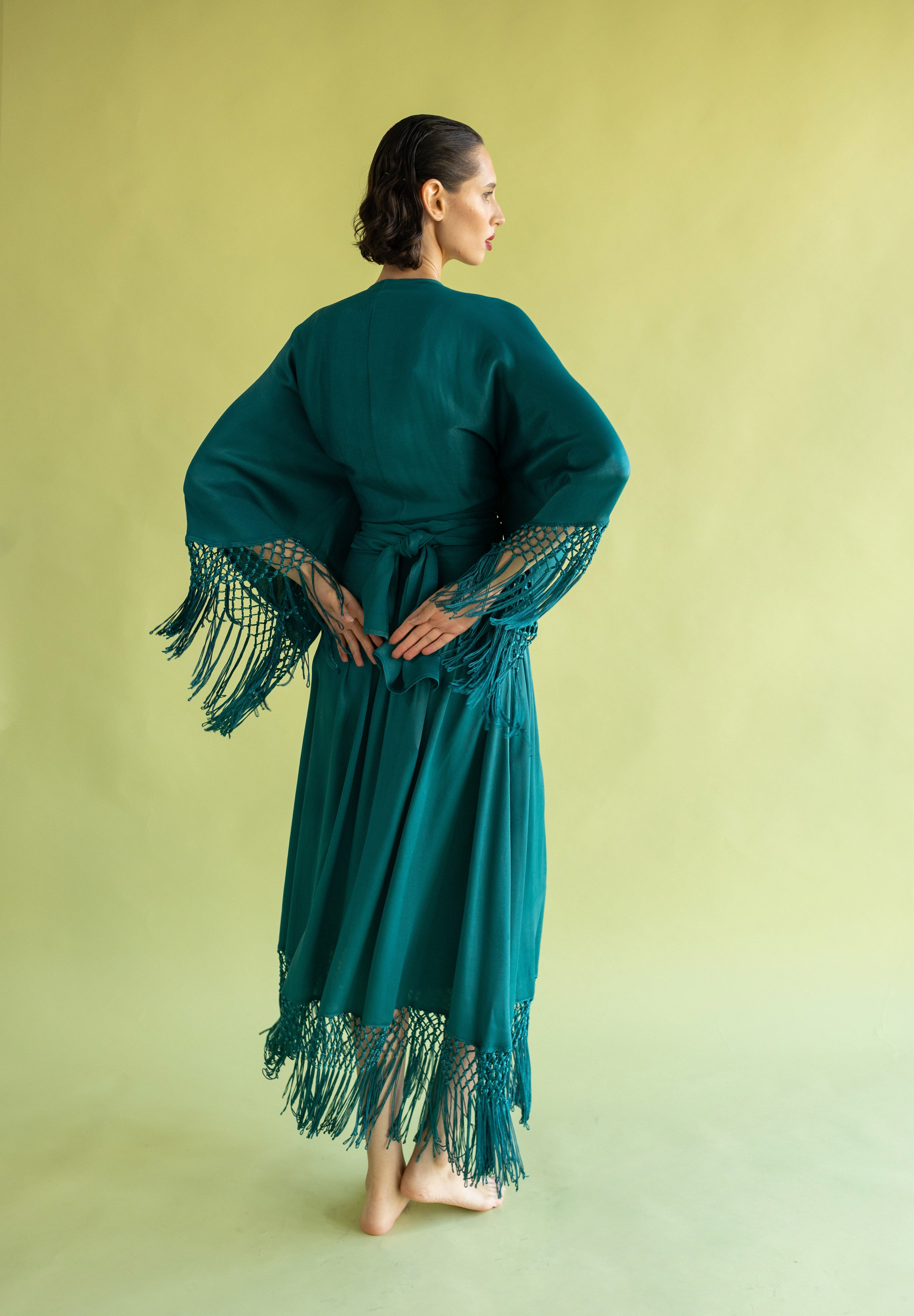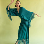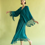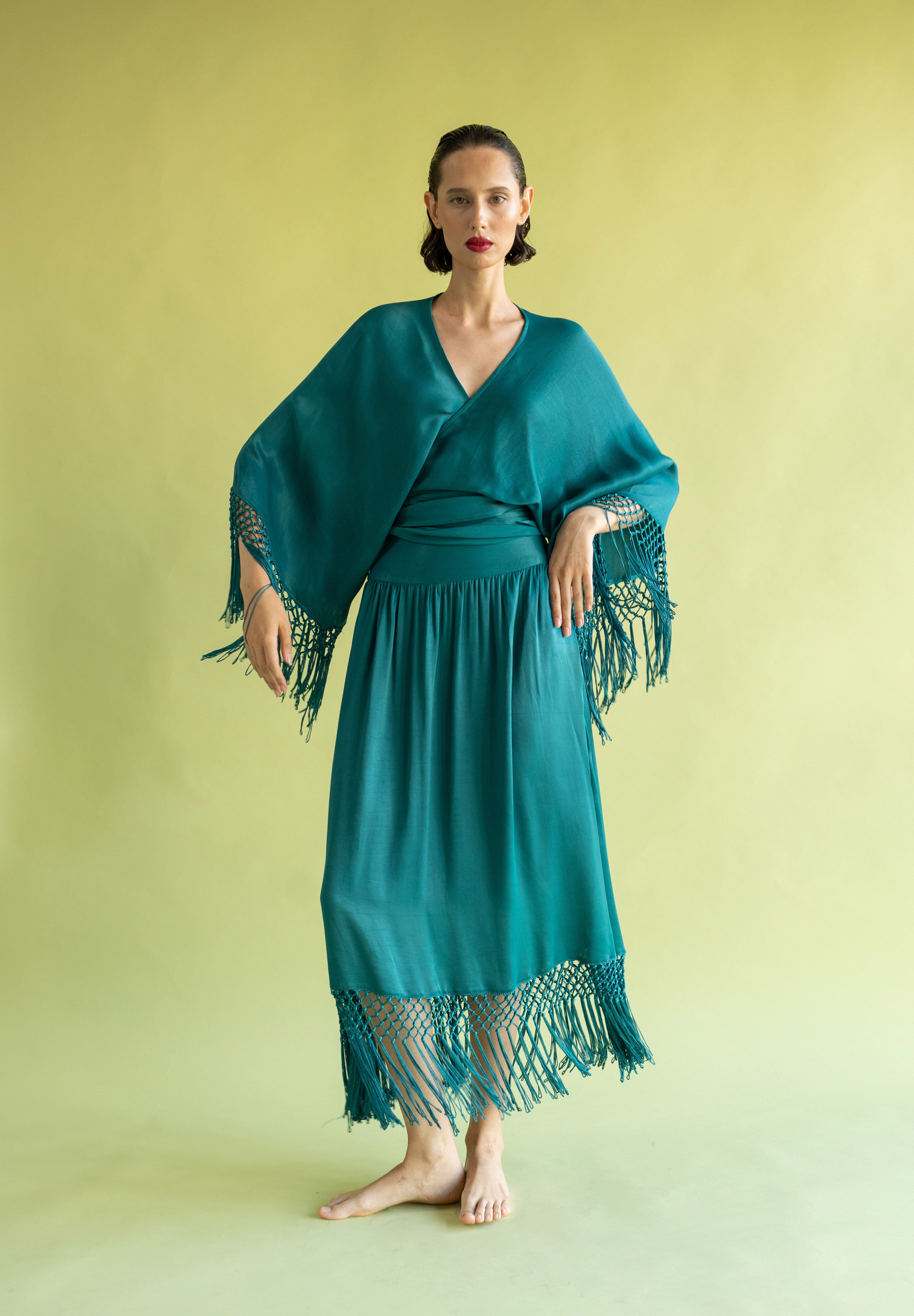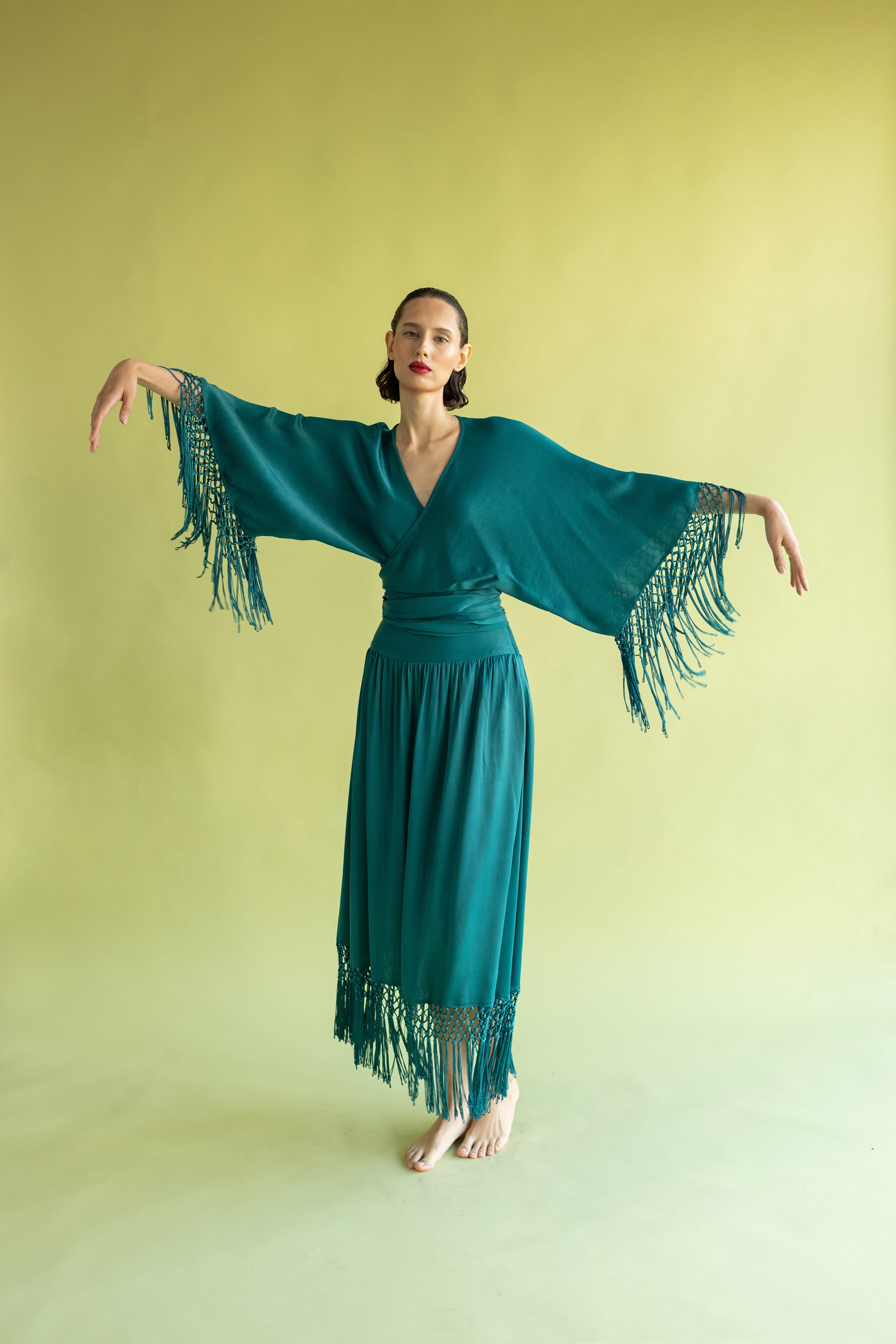Pieza de diseño de carácter singular confeccionada en crep satén. Este top destaca por sus extremos inferiores prolongados, diseñados para cruzarse y anudarse en una lazada que ciñe la silueta. El remate de flecos sus mangas aporta un movimiento rítmico y sofisticado, que contrasta con el brillo sutil del tejido. Una propuesta elegante que equilibra a la perfección movimiento y delicadeza.