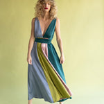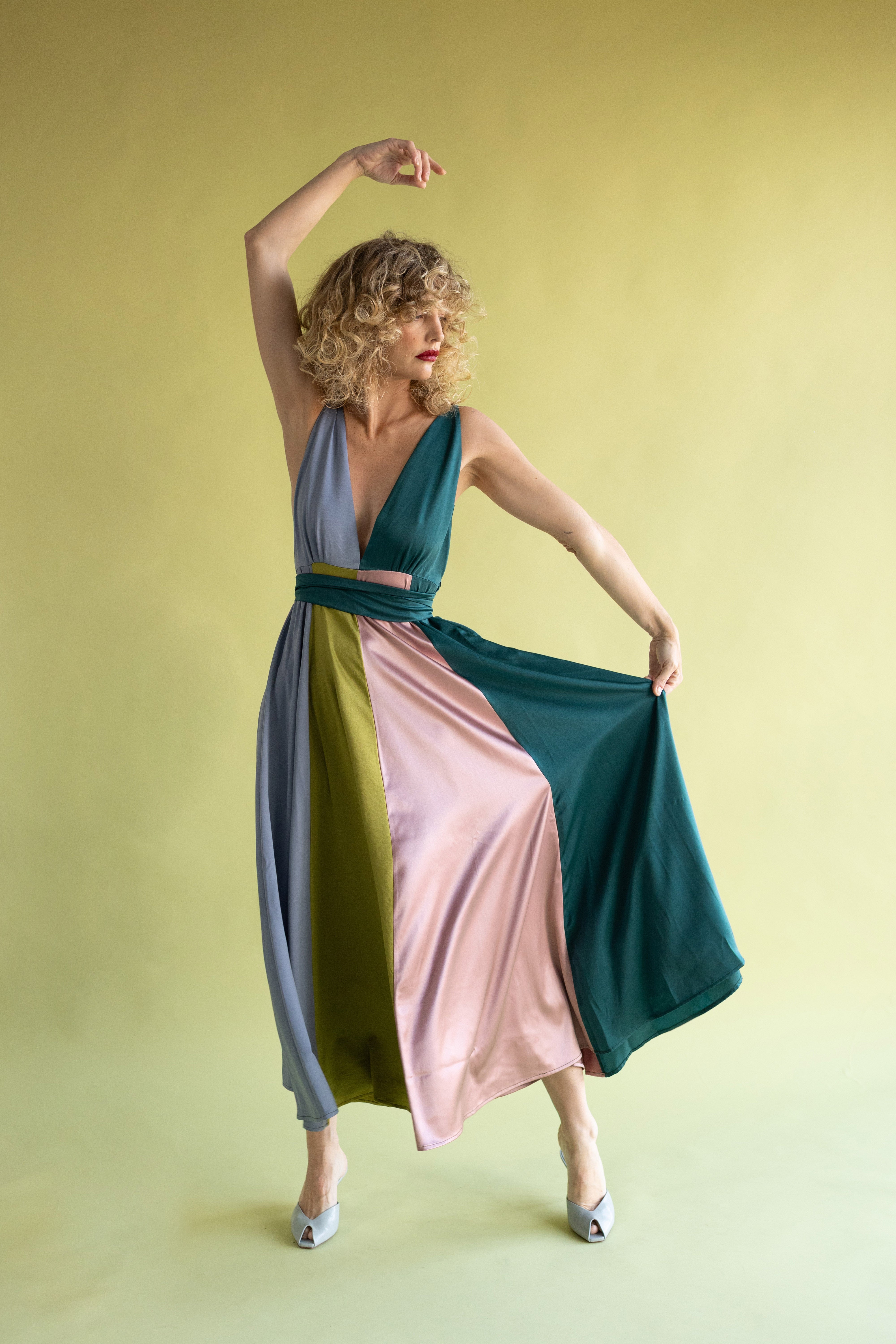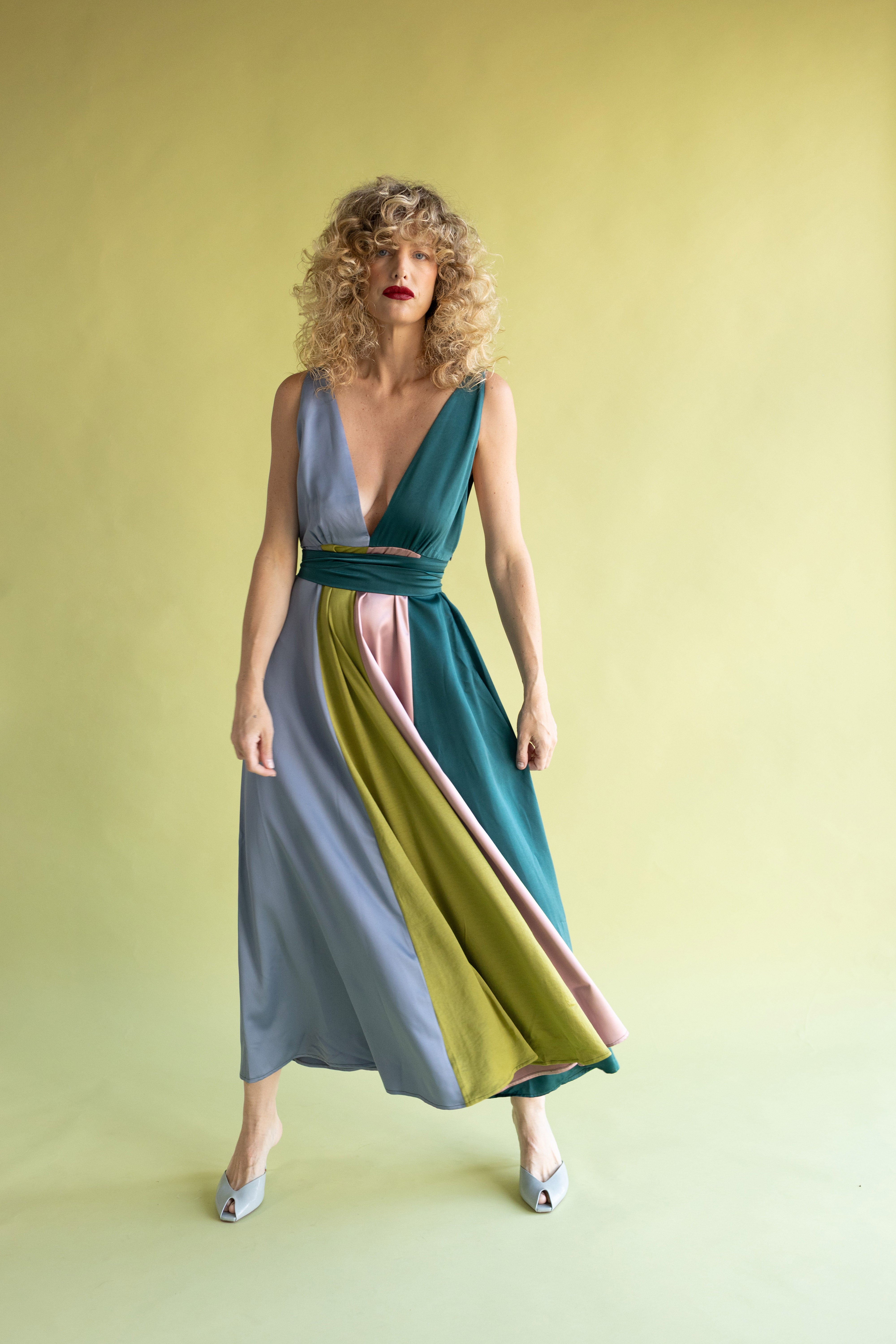 Vestido de corte minimalista en satén crepé. Más allá de su vibrante propuesta de color y su opción multicolor, su valor reside en un patrón de líneas rectas que fluye hacia una caída con peso y brillo discreto. El corte está pensado para priorizar el movimiento del tejido, creando una silueta limpia.