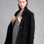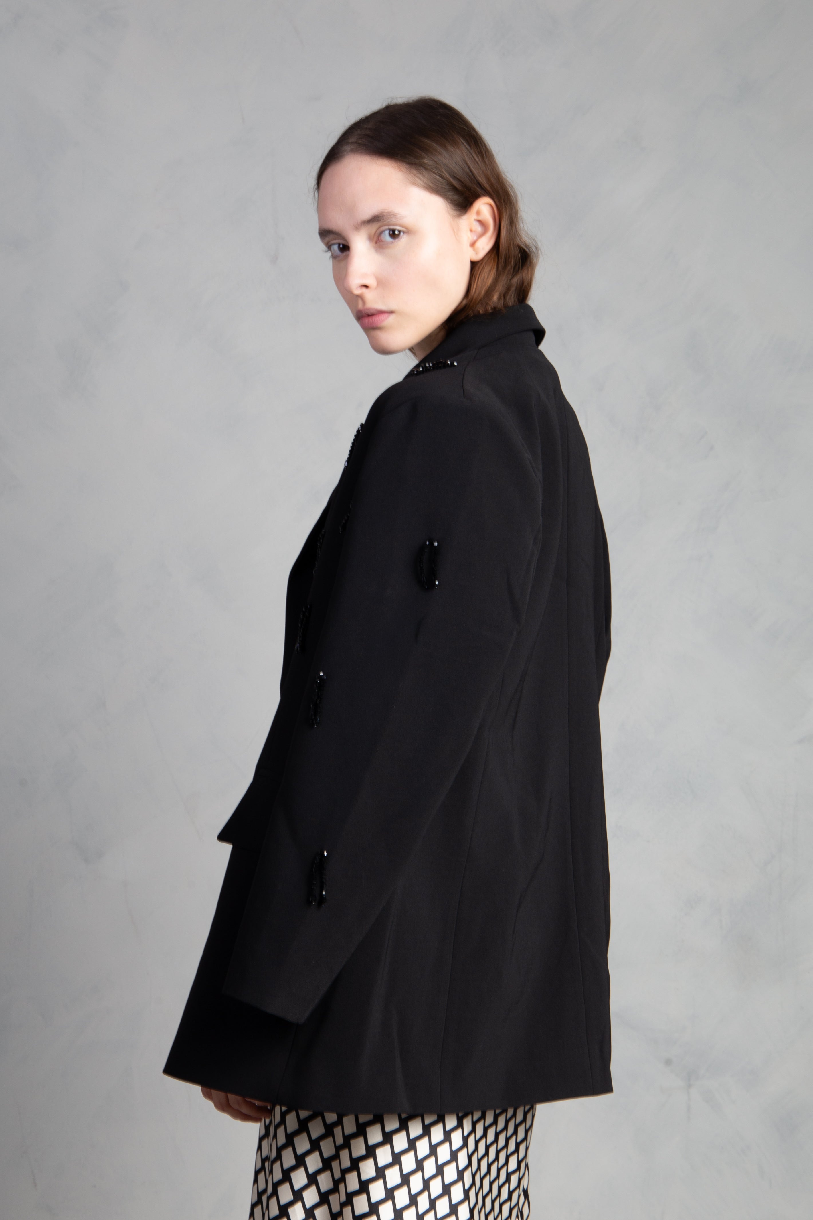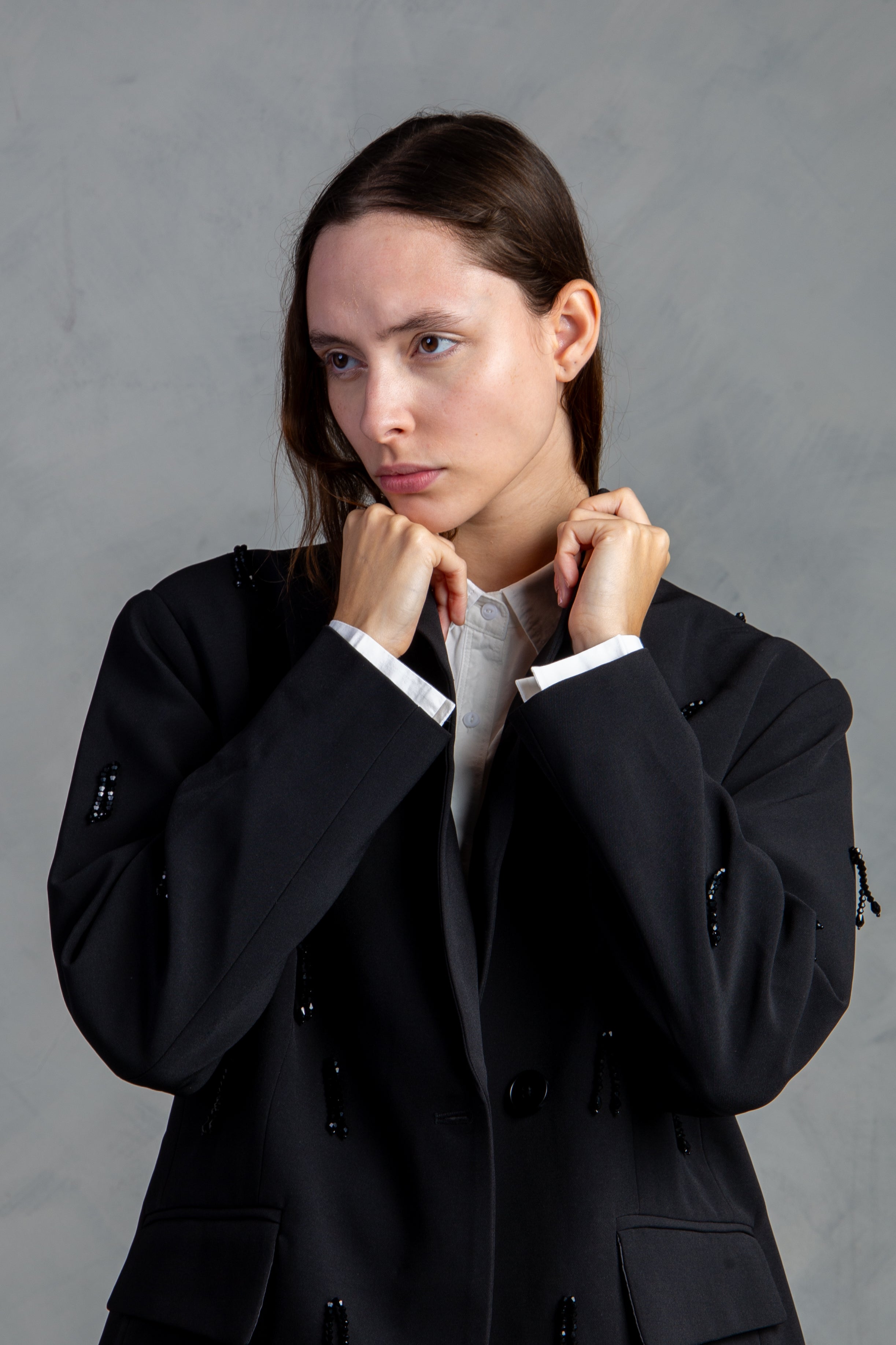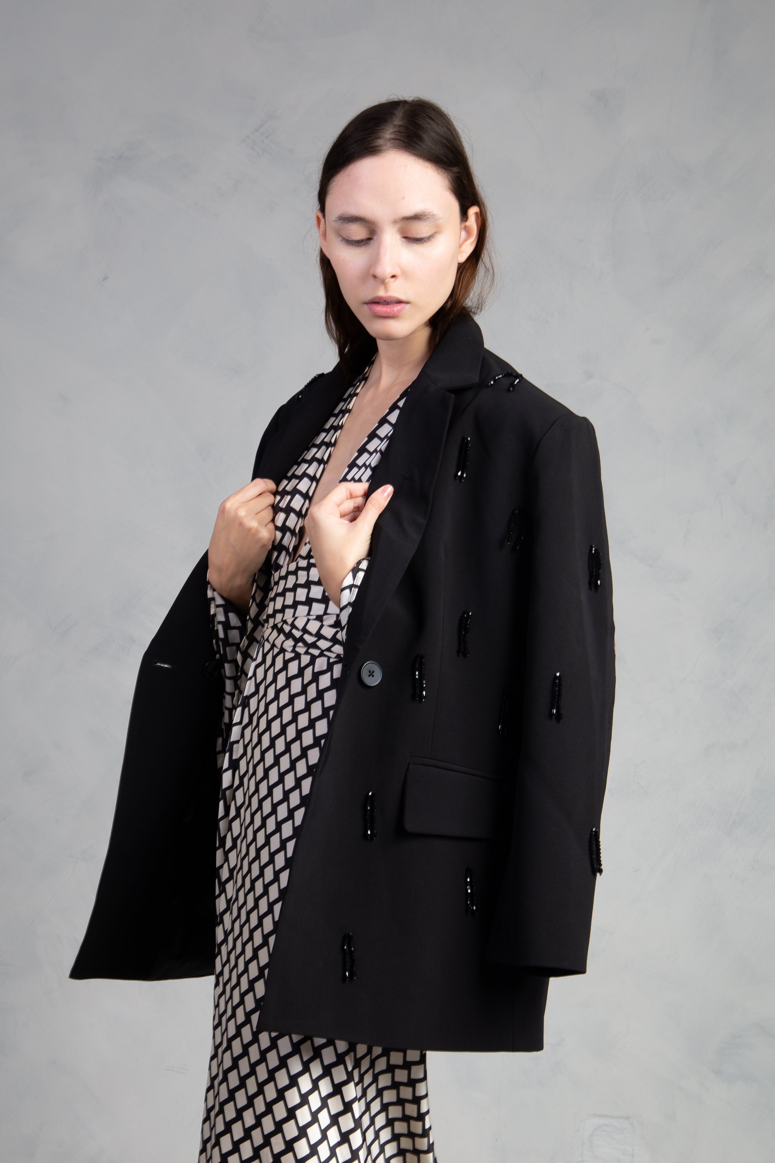 Blazer amplia de cuello solapa y manga larga con hombreras. Detalles frontales en piedras negras.
