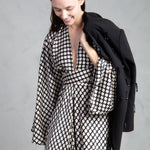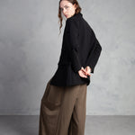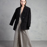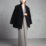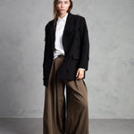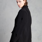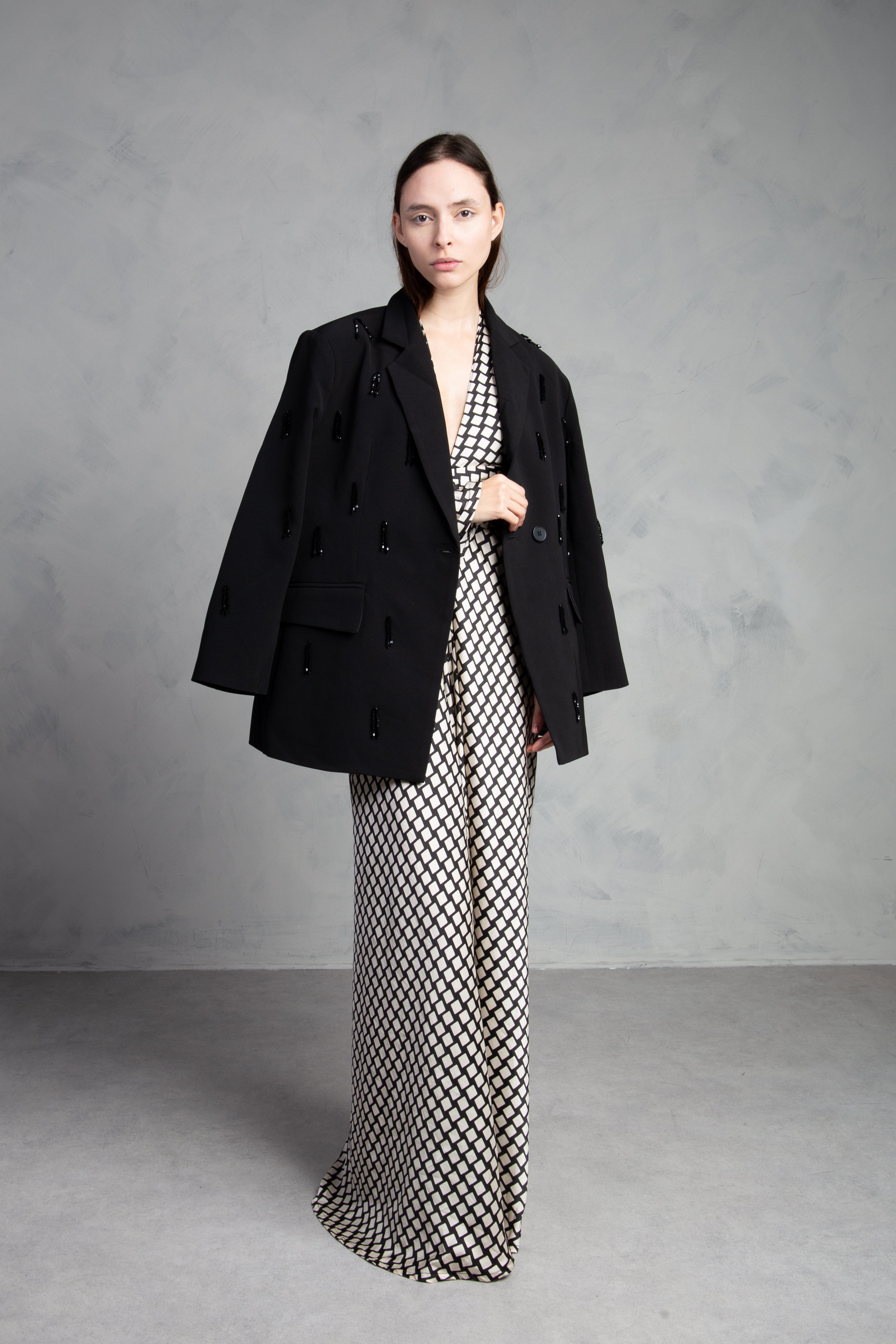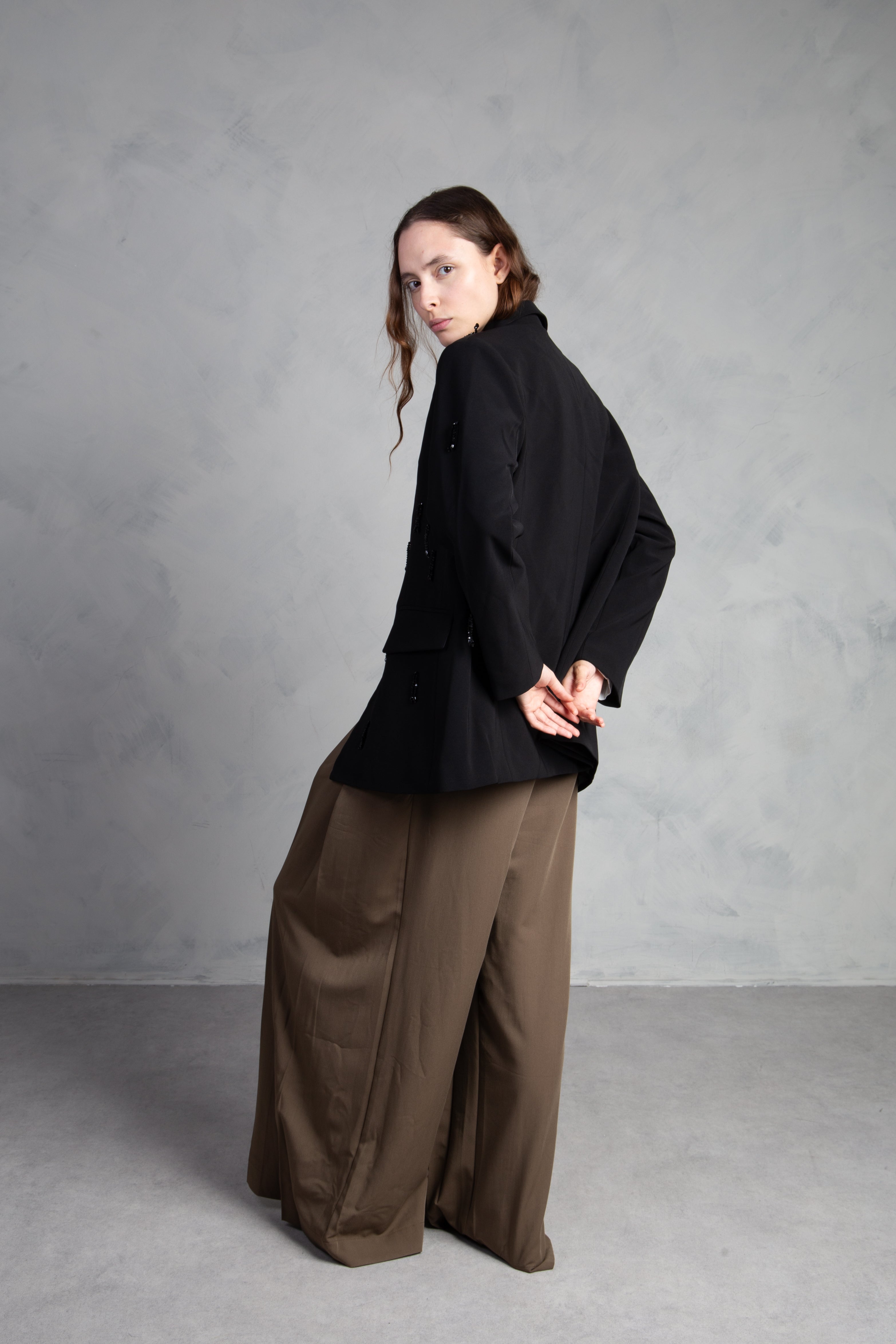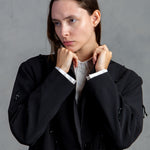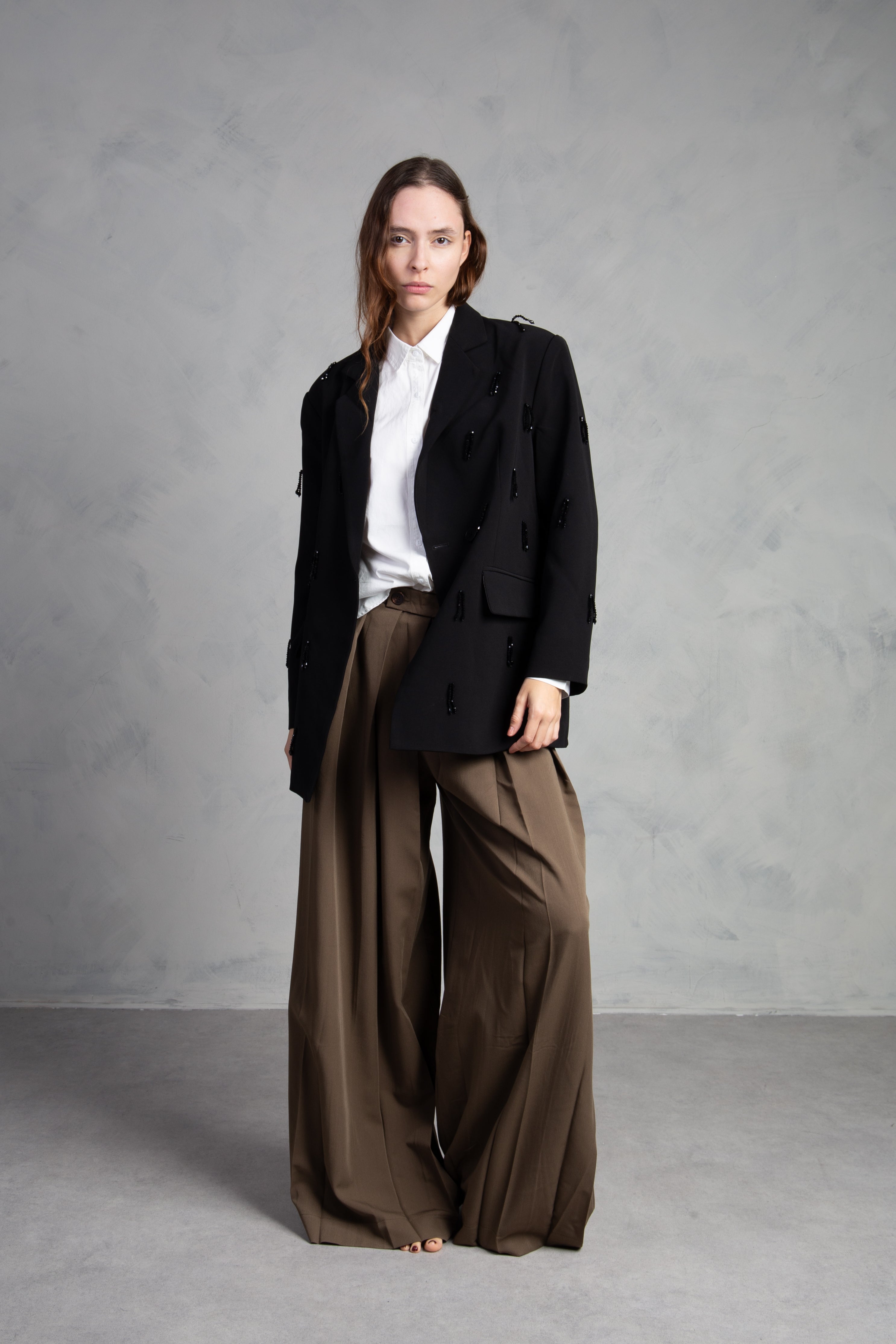 Blazer amplia de cuello solapa y manga larga con hombreras. Detalles frontales en piedras negras.