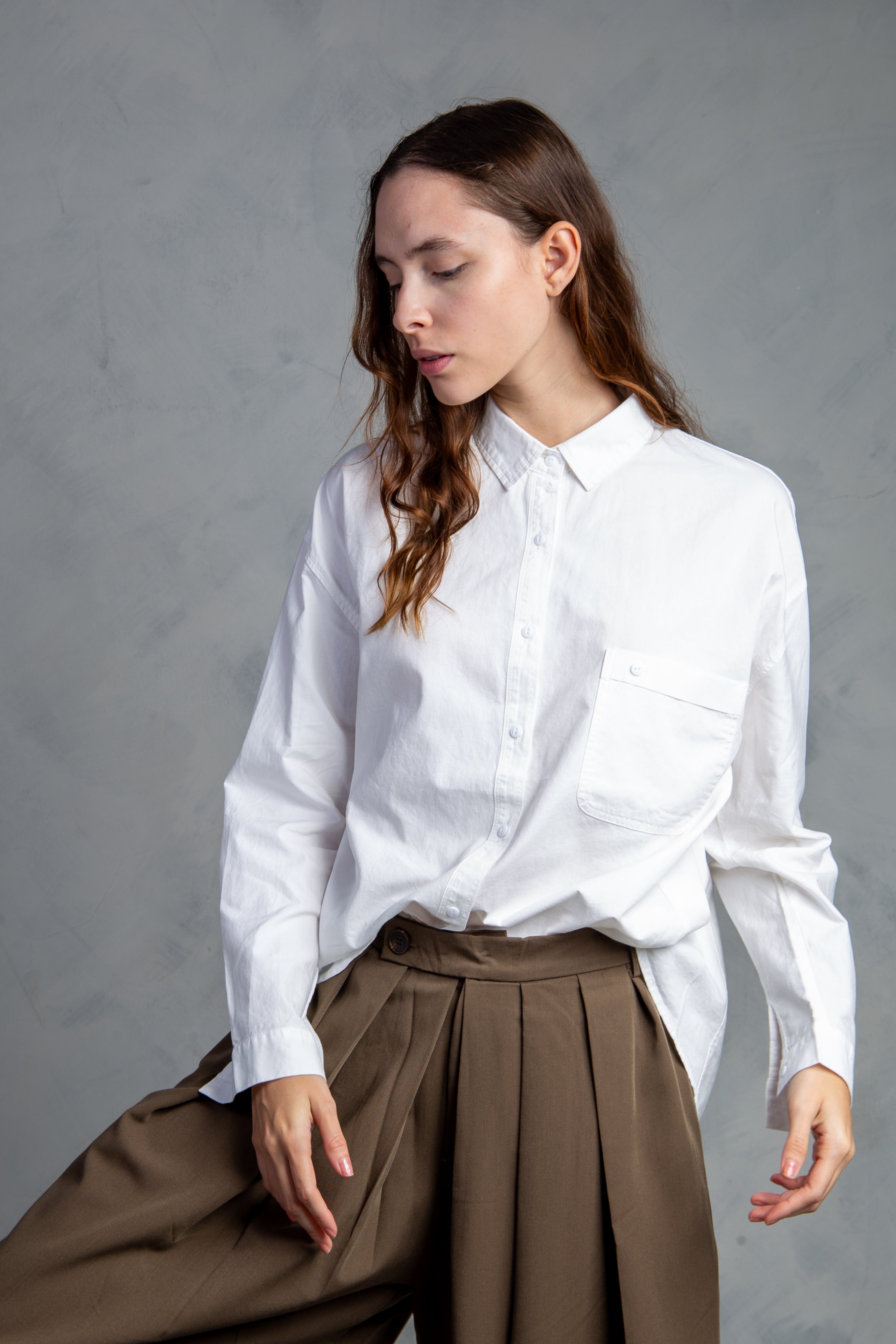 Camisa fluida con manga larga, cuello camisero, cierre con botonadura frontal, botones en mangas y bolsillo frontal.