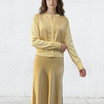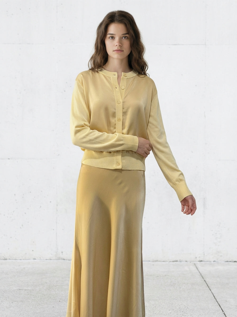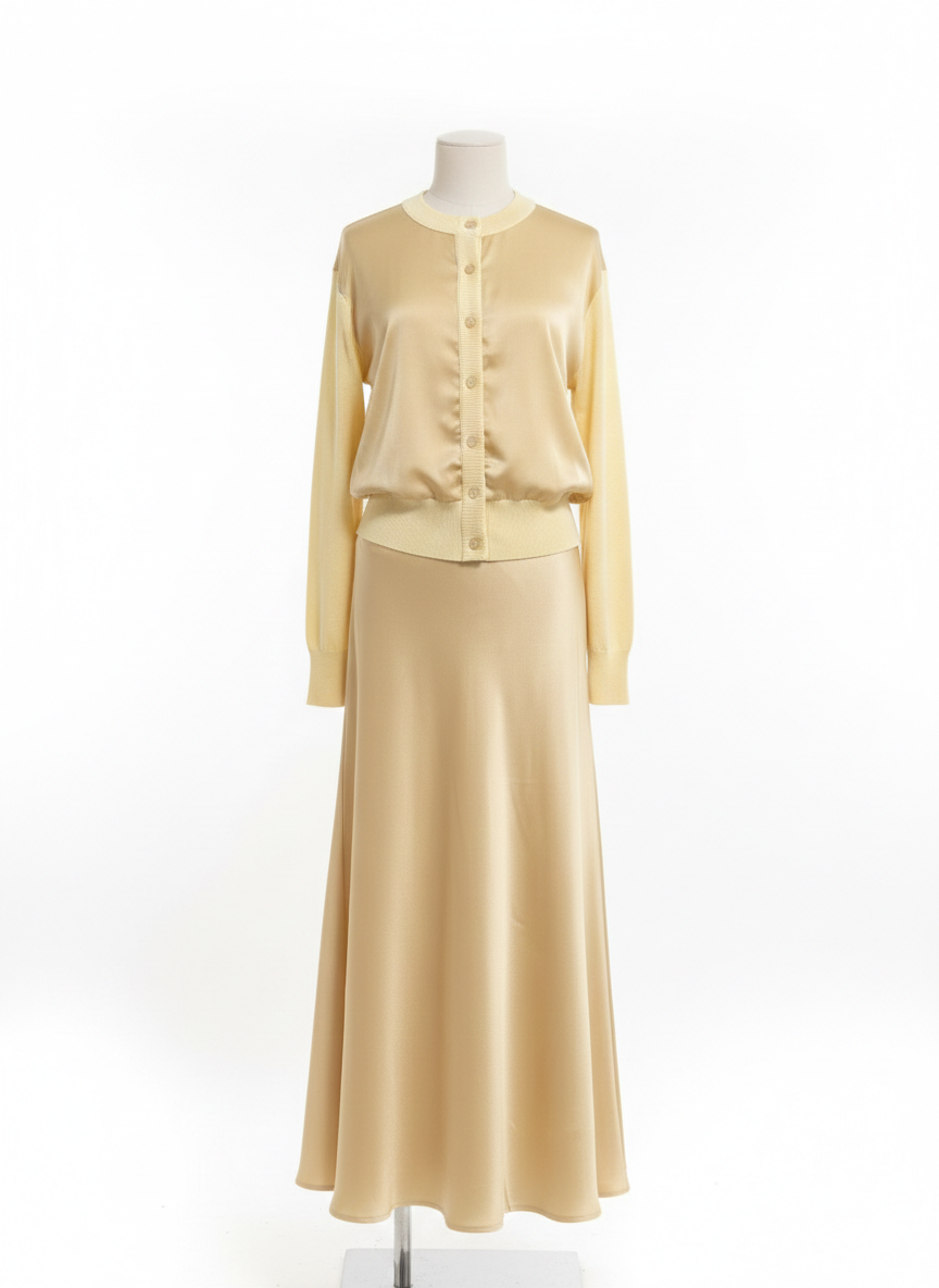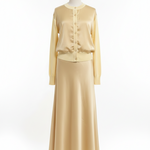 Un estilismo de carácter minimalista y silueta fluida confeccionado en viscosa. La camisa de cuello redondo y botonadura revestida se combina con una falda envolvente de tiro alto que se ajusta a la cintura, creando un movimiento armónico y elegante. Un conjunto de líneas puras y brillo sutil, diseñado para ofrecer versatilidad y una sofisticación atemporal.