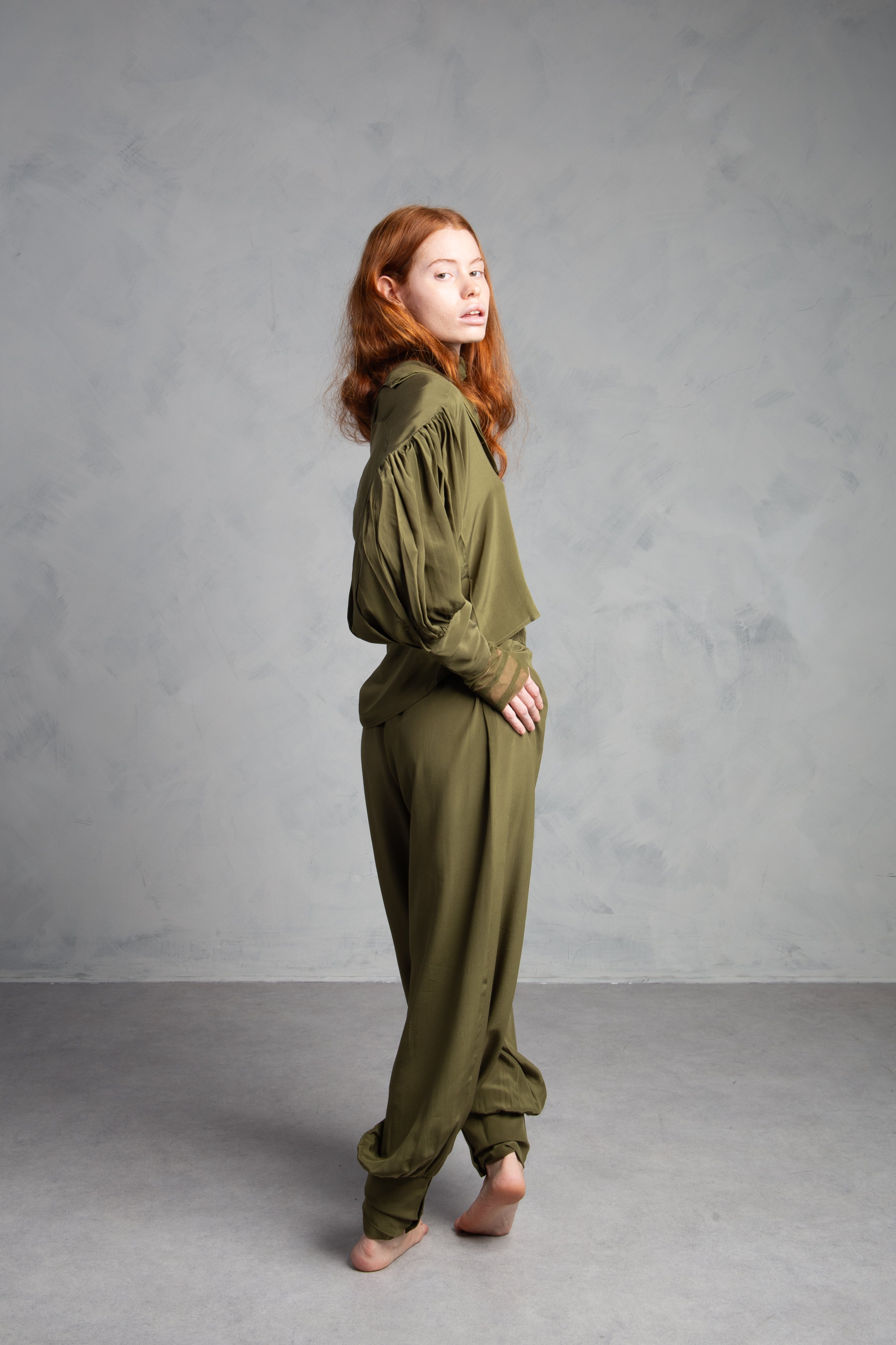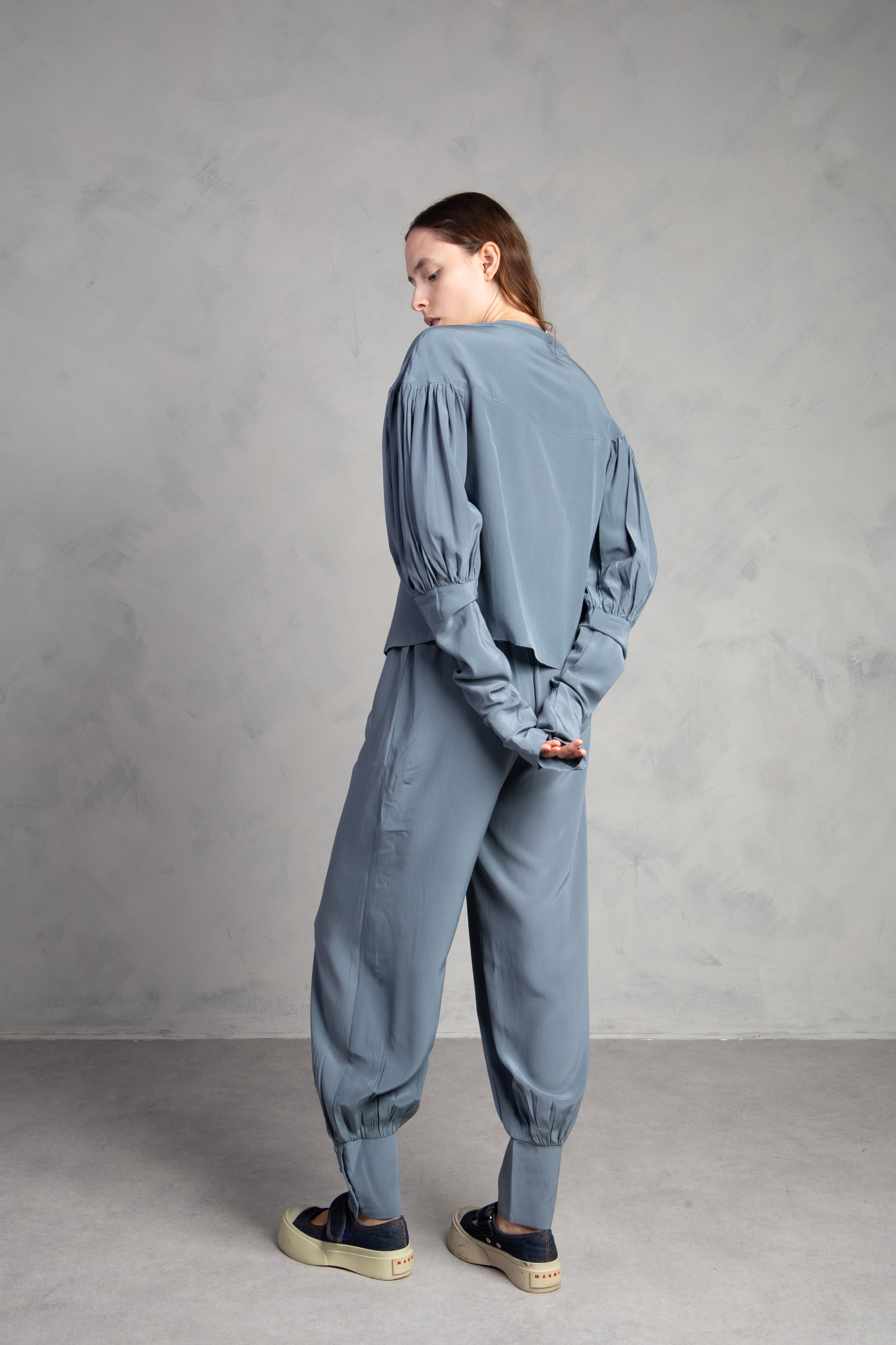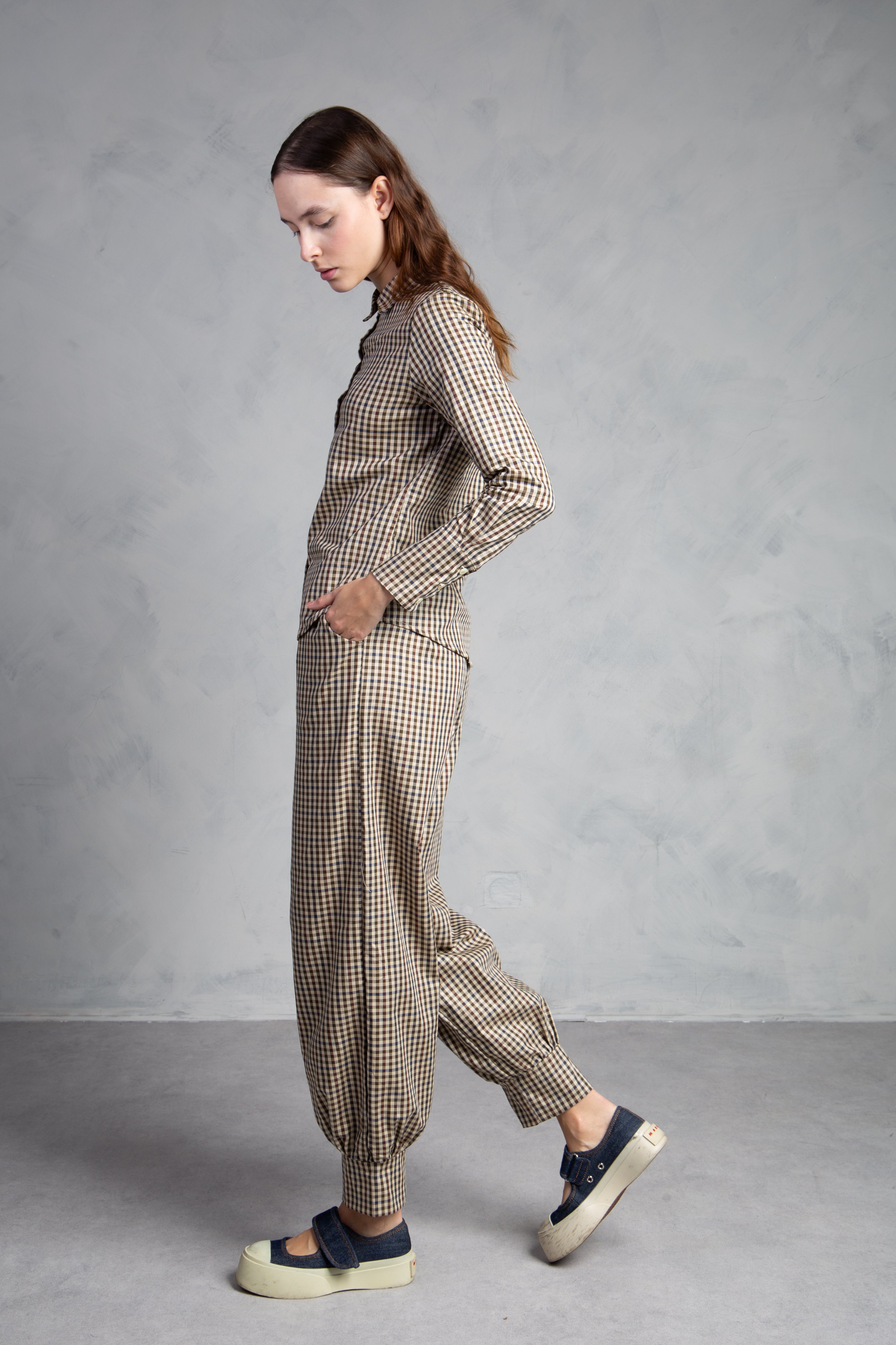 Pantalón bombacho fluido, cintura ajustable con tiras, tiro alto y acabado inferior con puño.