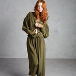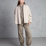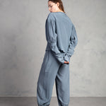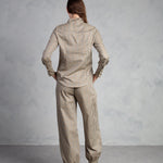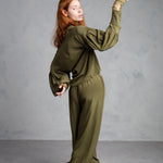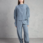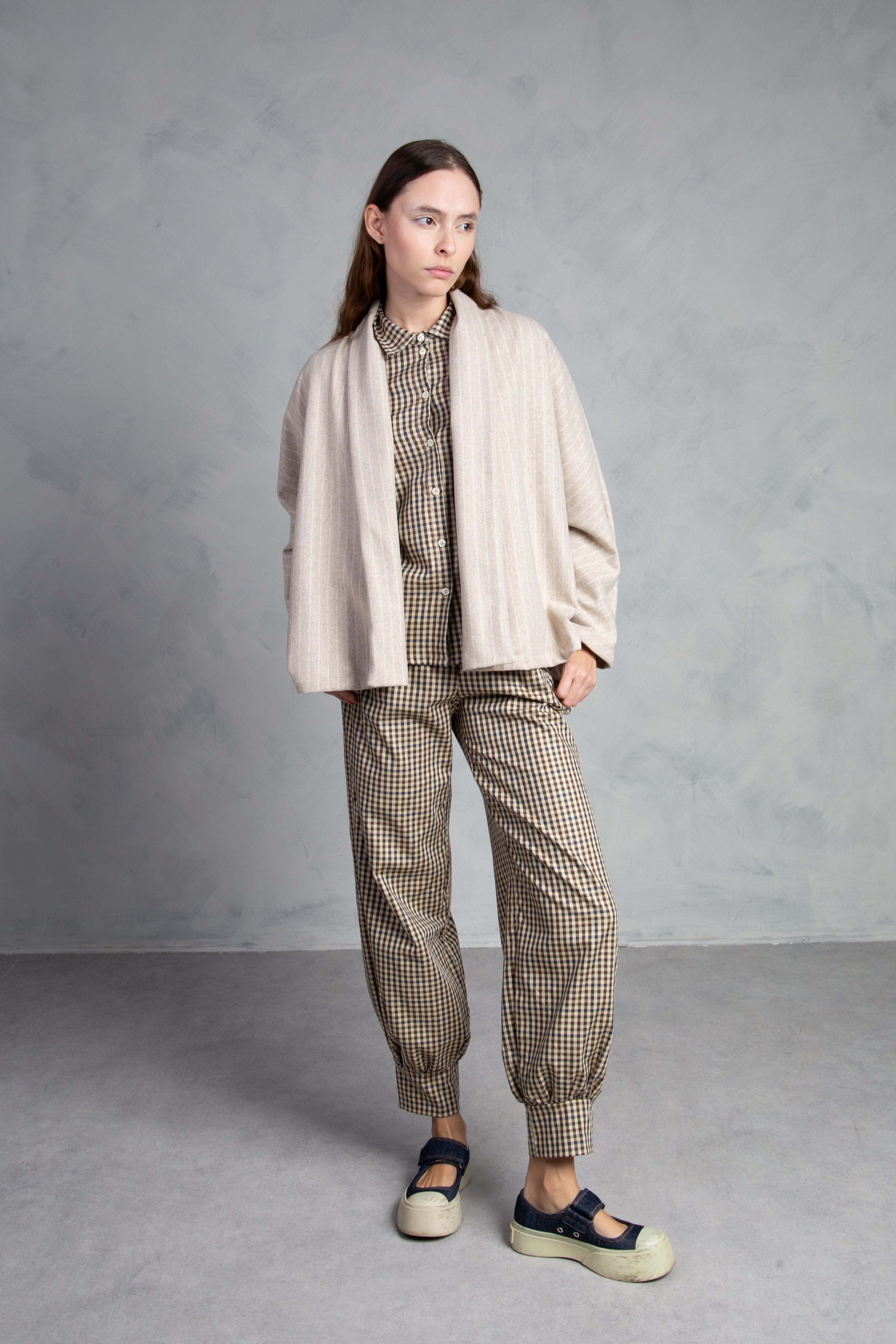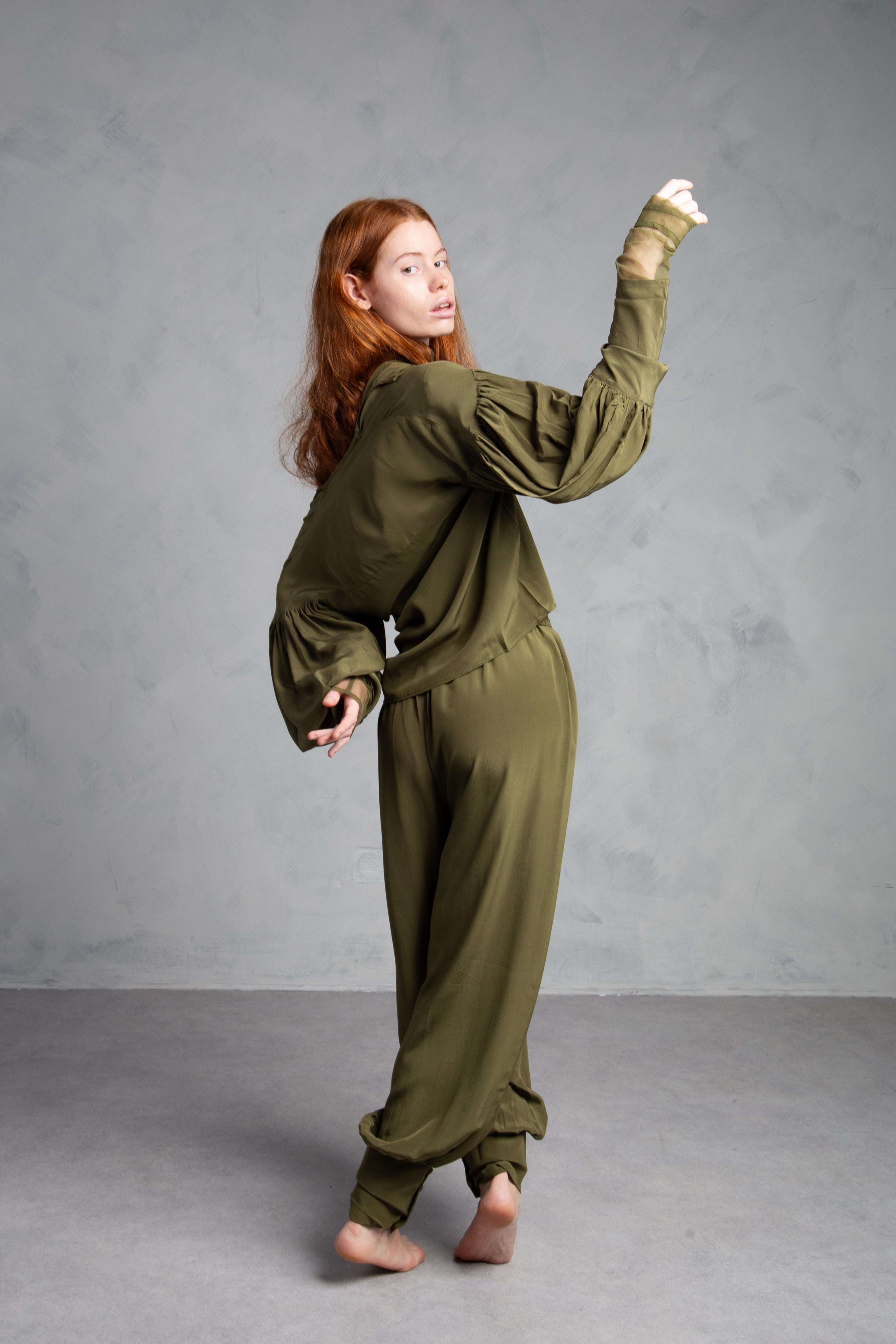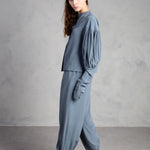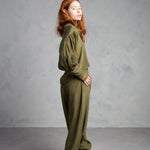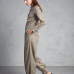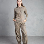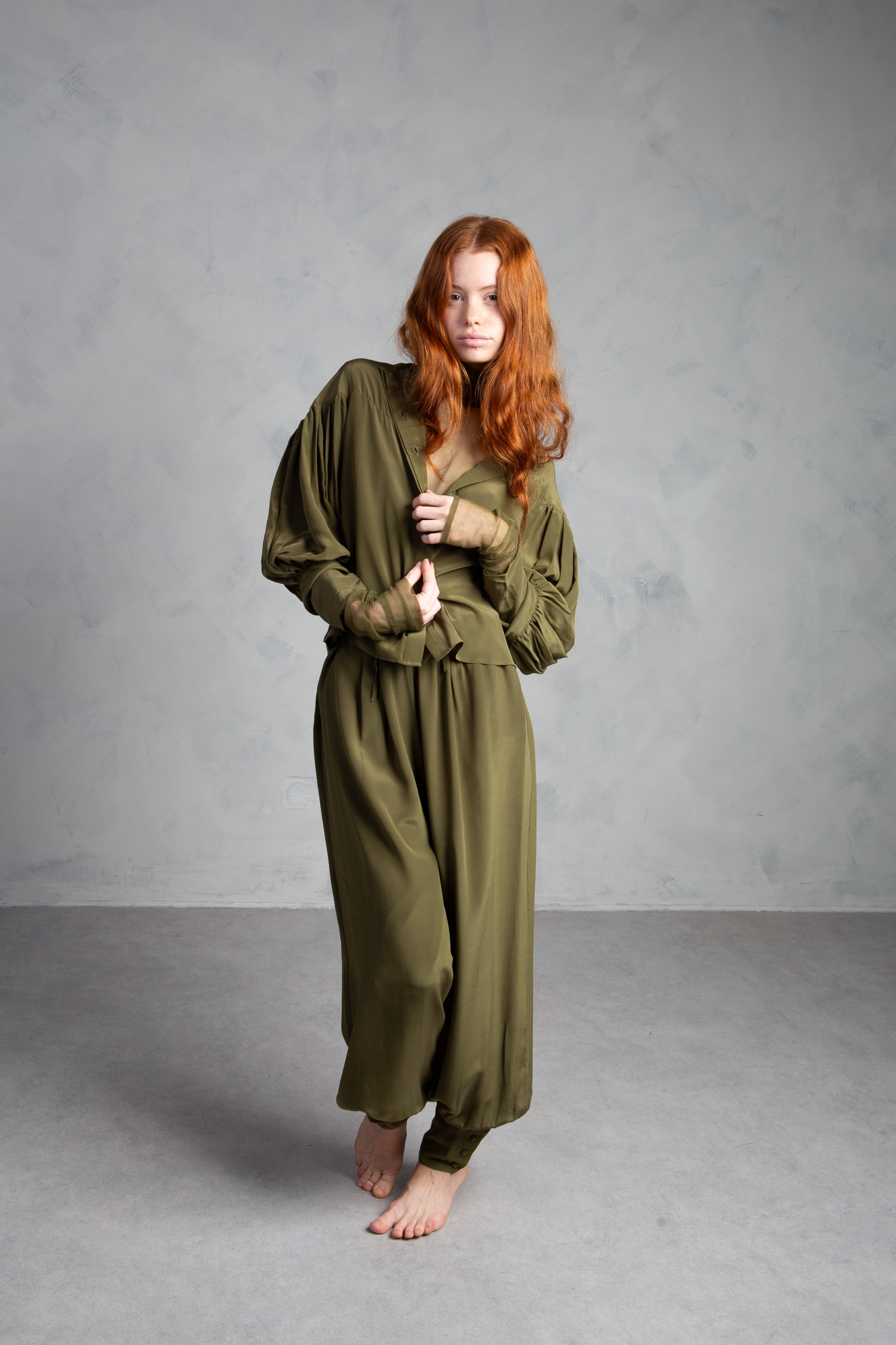 Pantalón bombacho fluido, cintura ajustable con tiras, tiro alto y acabado inferior con puño.