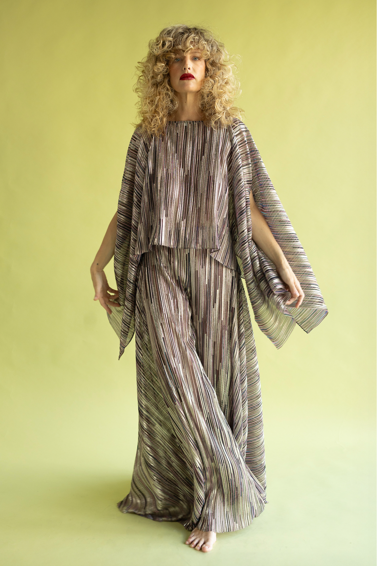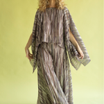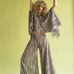 Pantalón de talle alto y pernera ancha, tipo palazzo. Confeccionado en punto plisado con lúrex, un tejido que además de ser comodísimo, tiene caída fluida y brillo. La cintura elástica hace que sea súper cómodo, y el corte estiliza un montón.