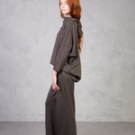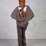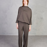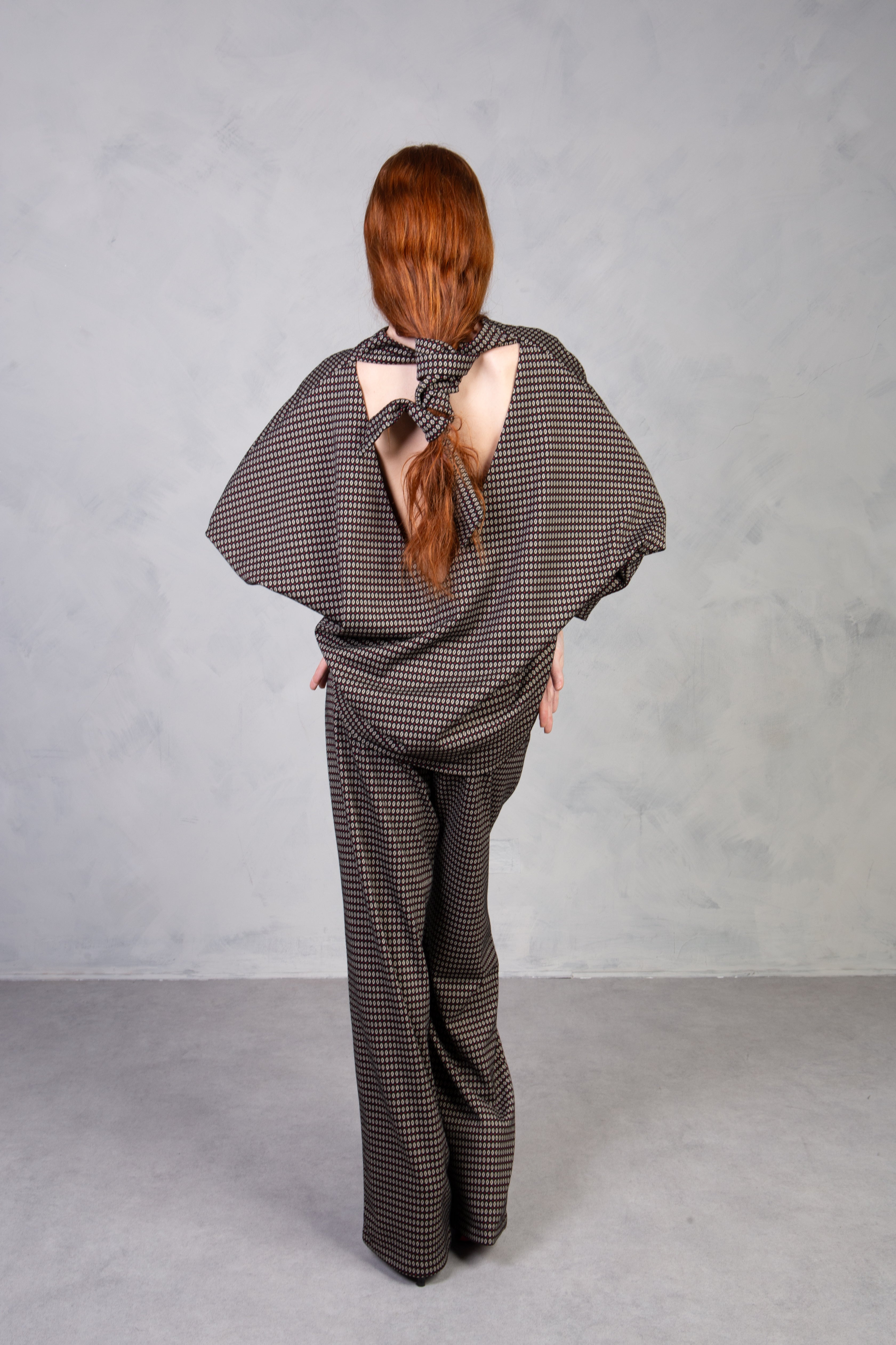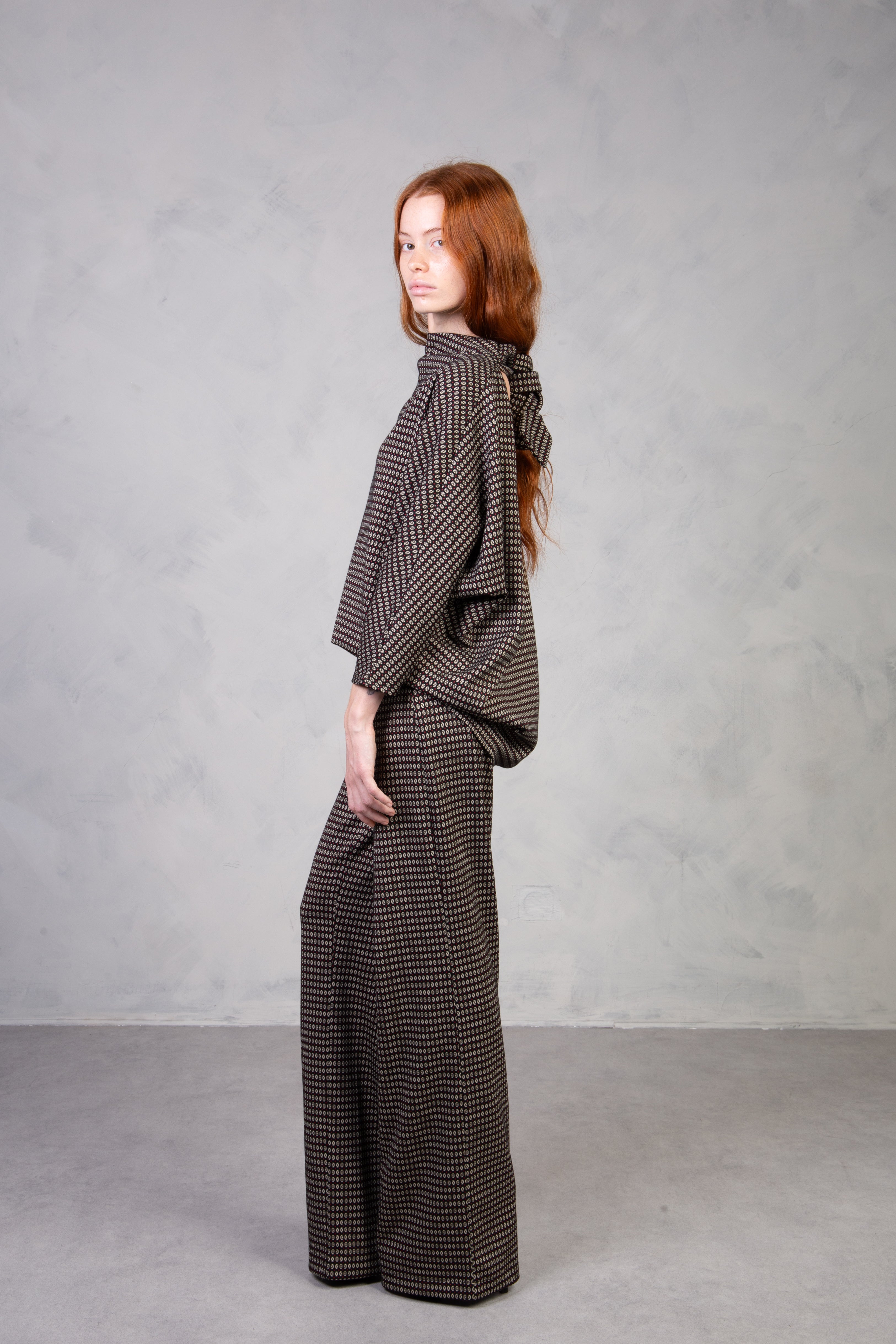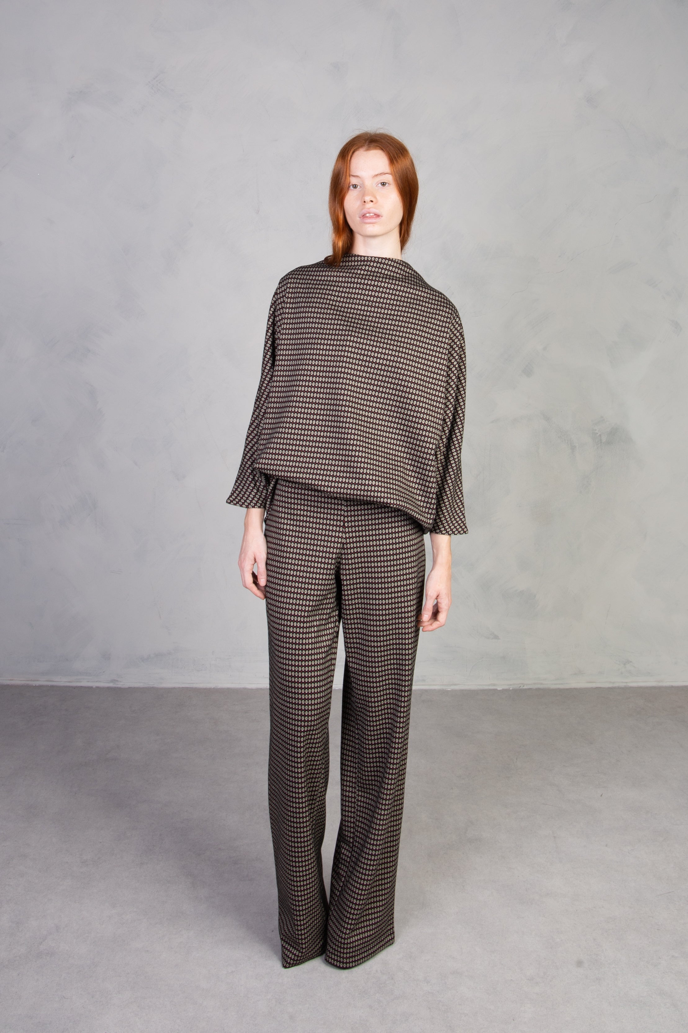Pantalón bicolor a cuadros de talle alto con pernera ancha y corte recto. Silueta fluida que alarga visualmente la figura.