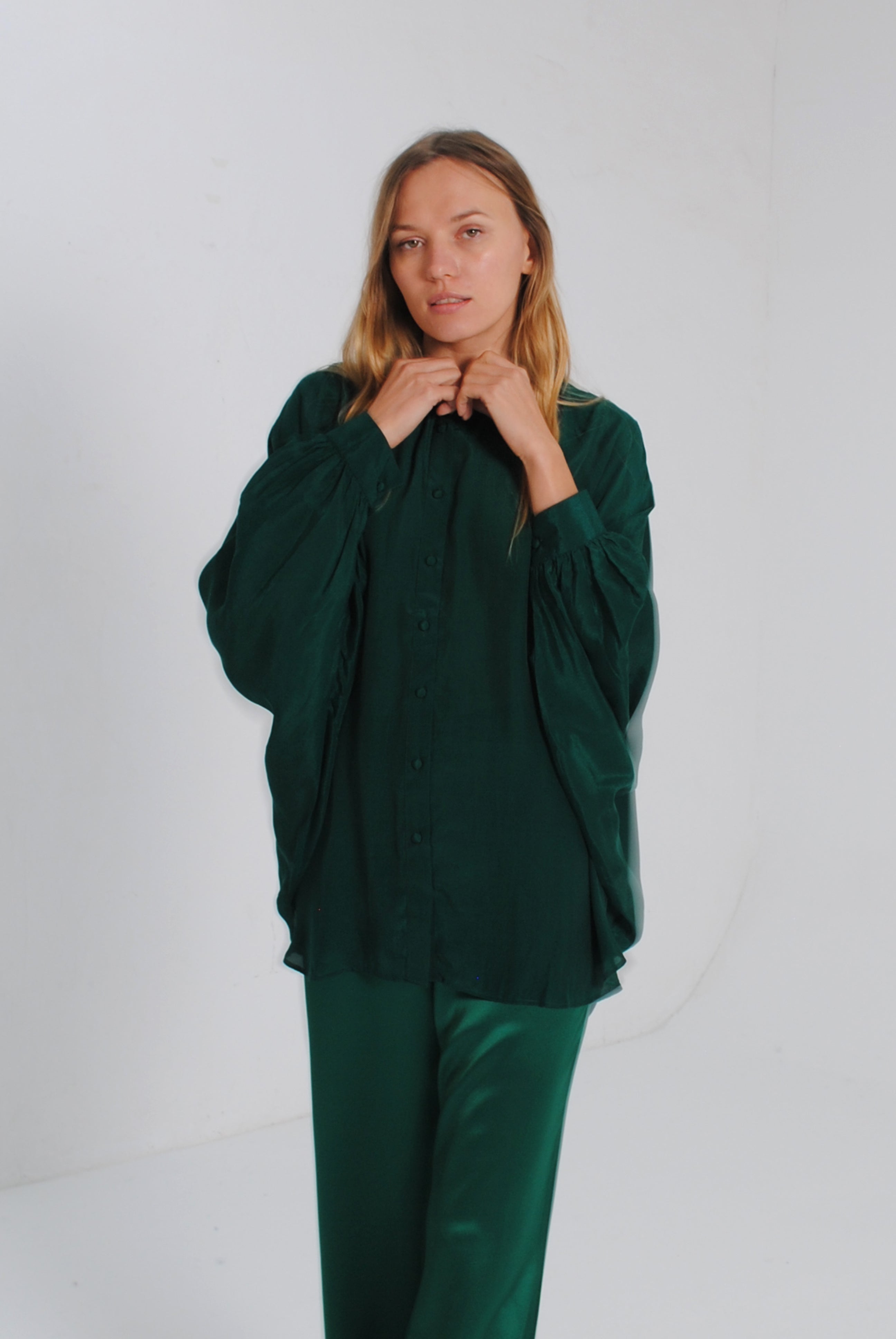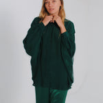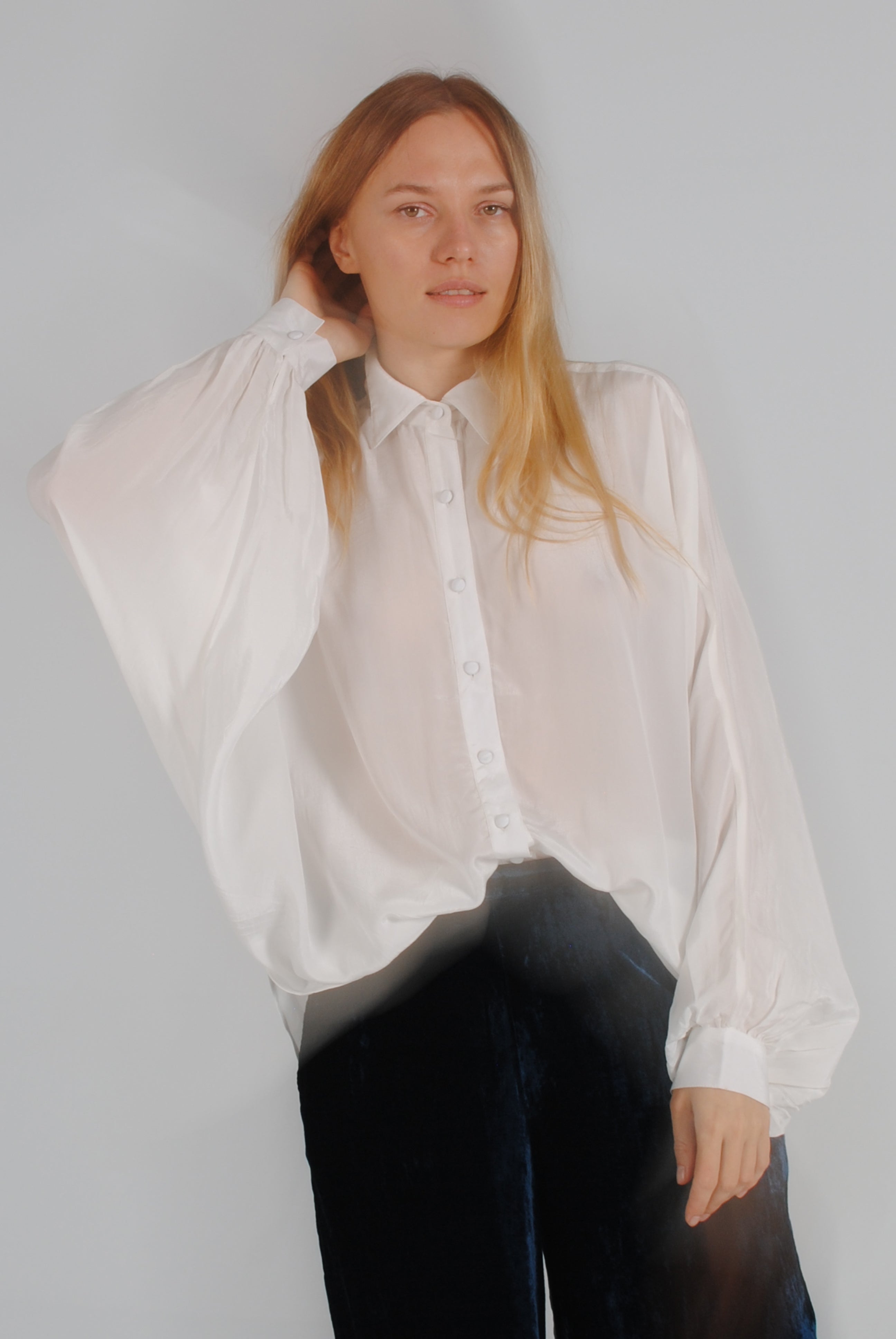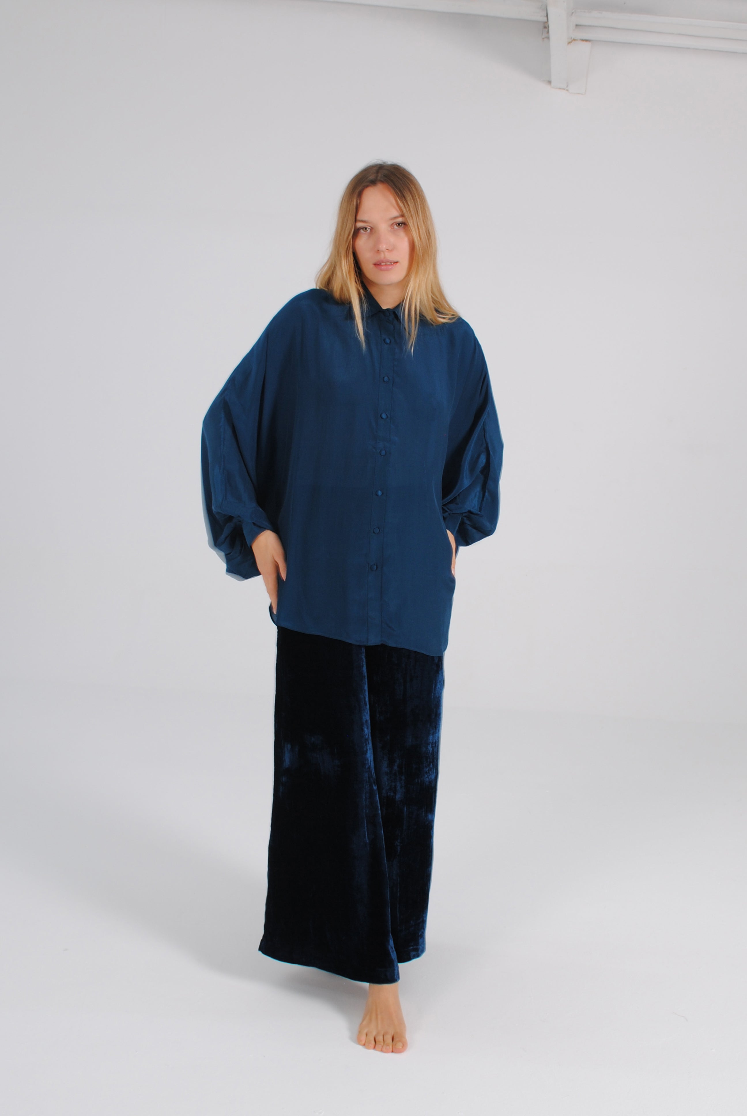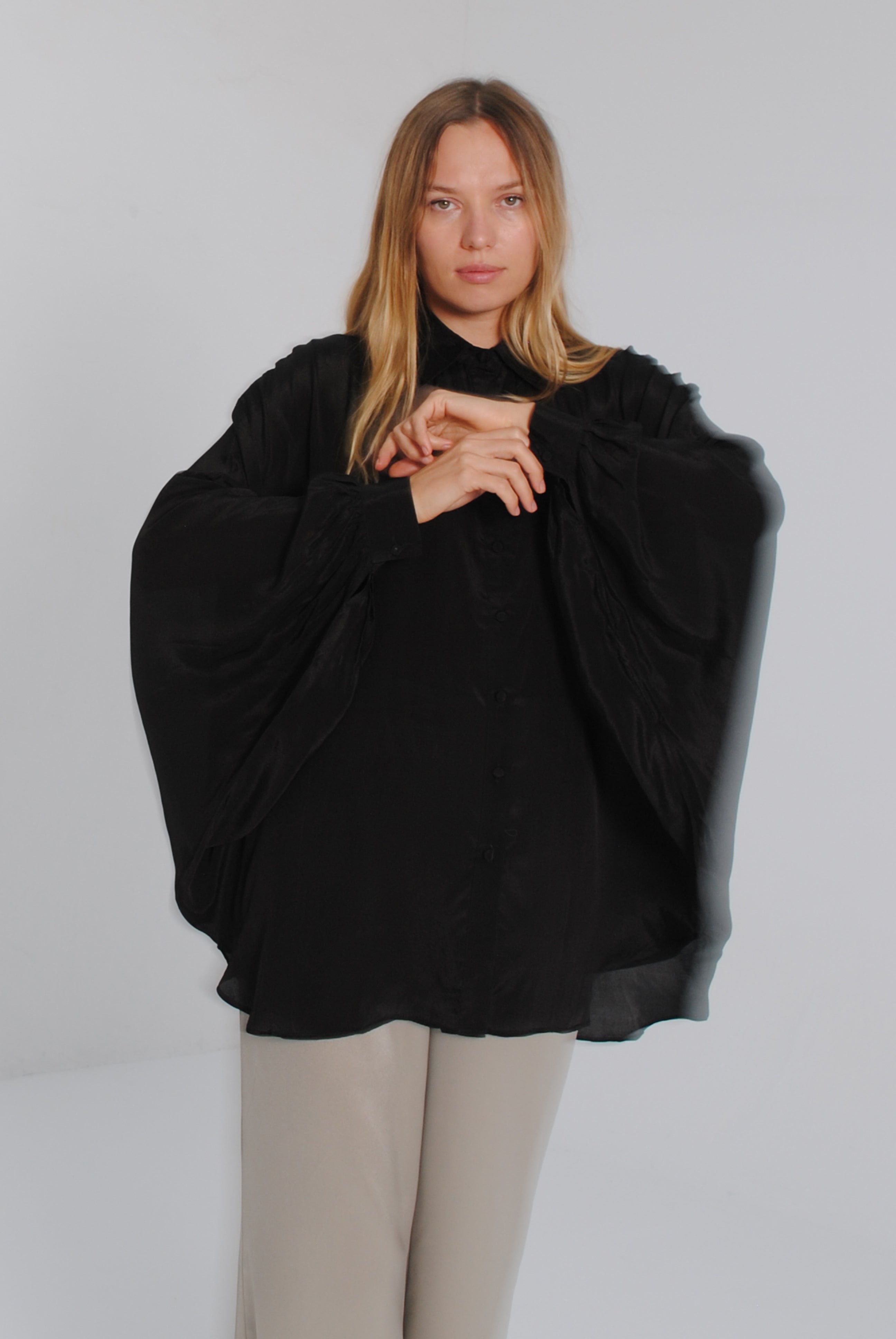 Camisa murciélago de cuello redondo con empuñadura de botón. Botonadura frontal revestida del mismo tejido que la prenda, cuello redondo y sin bolsillos.