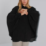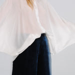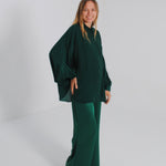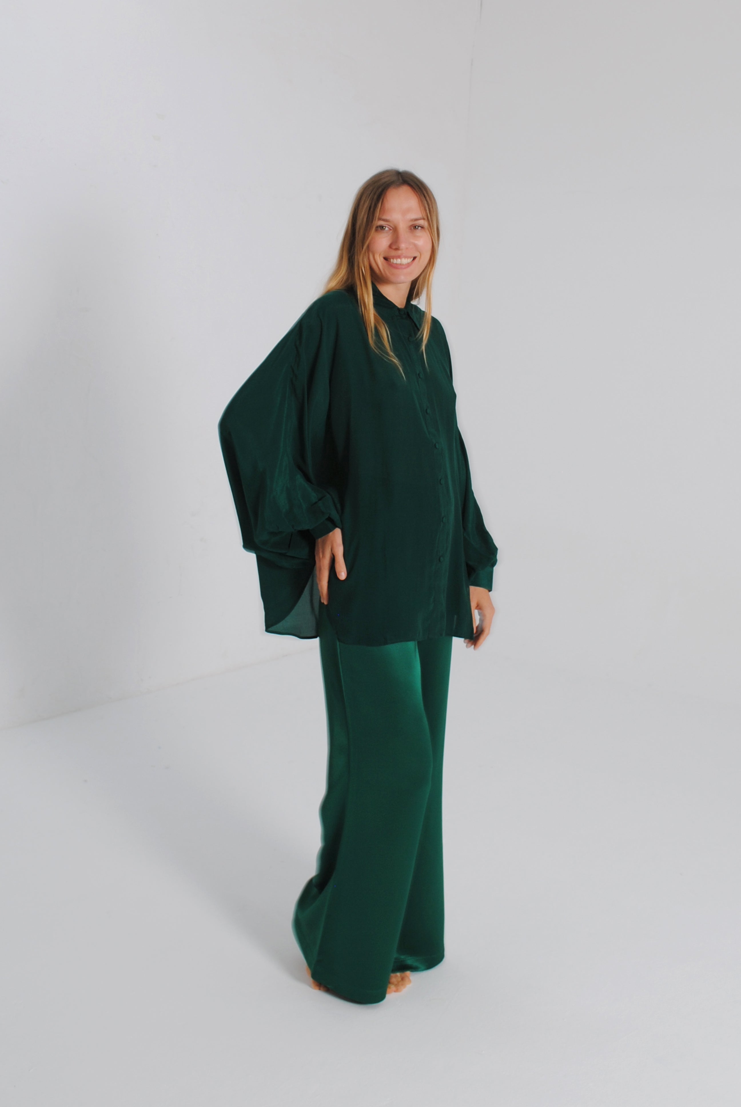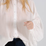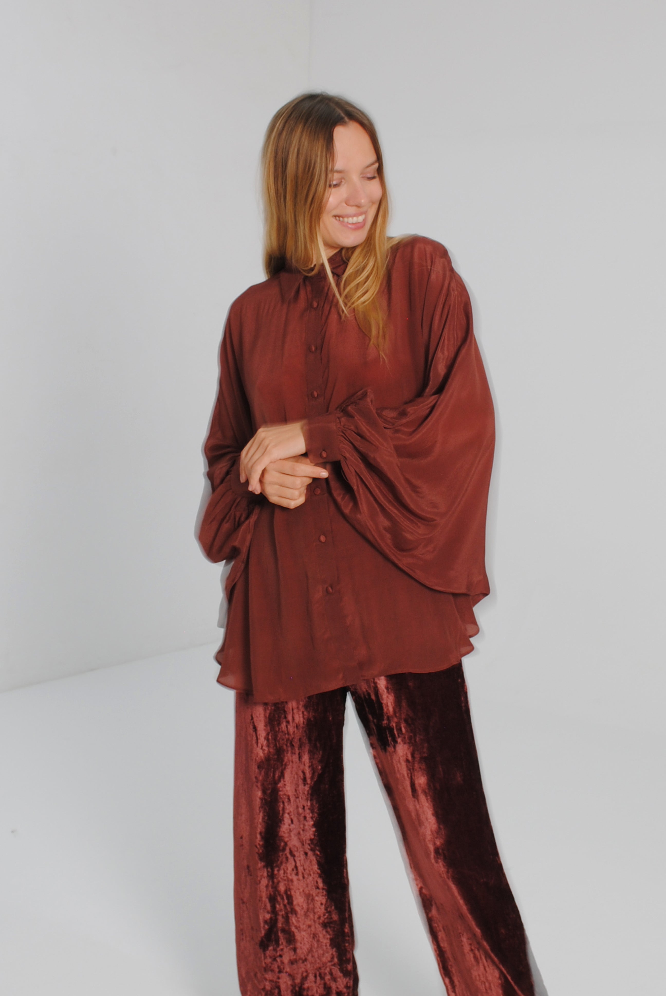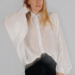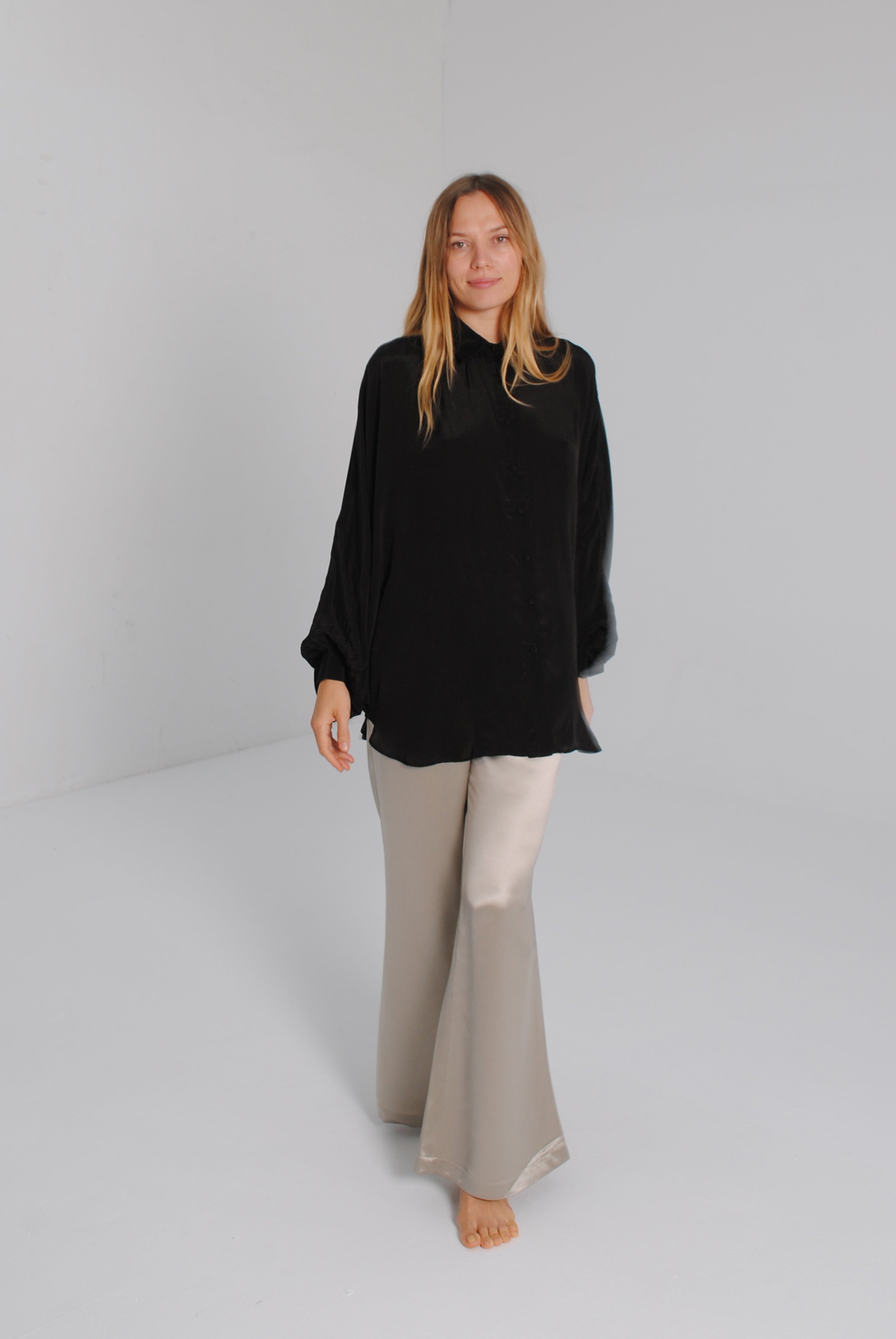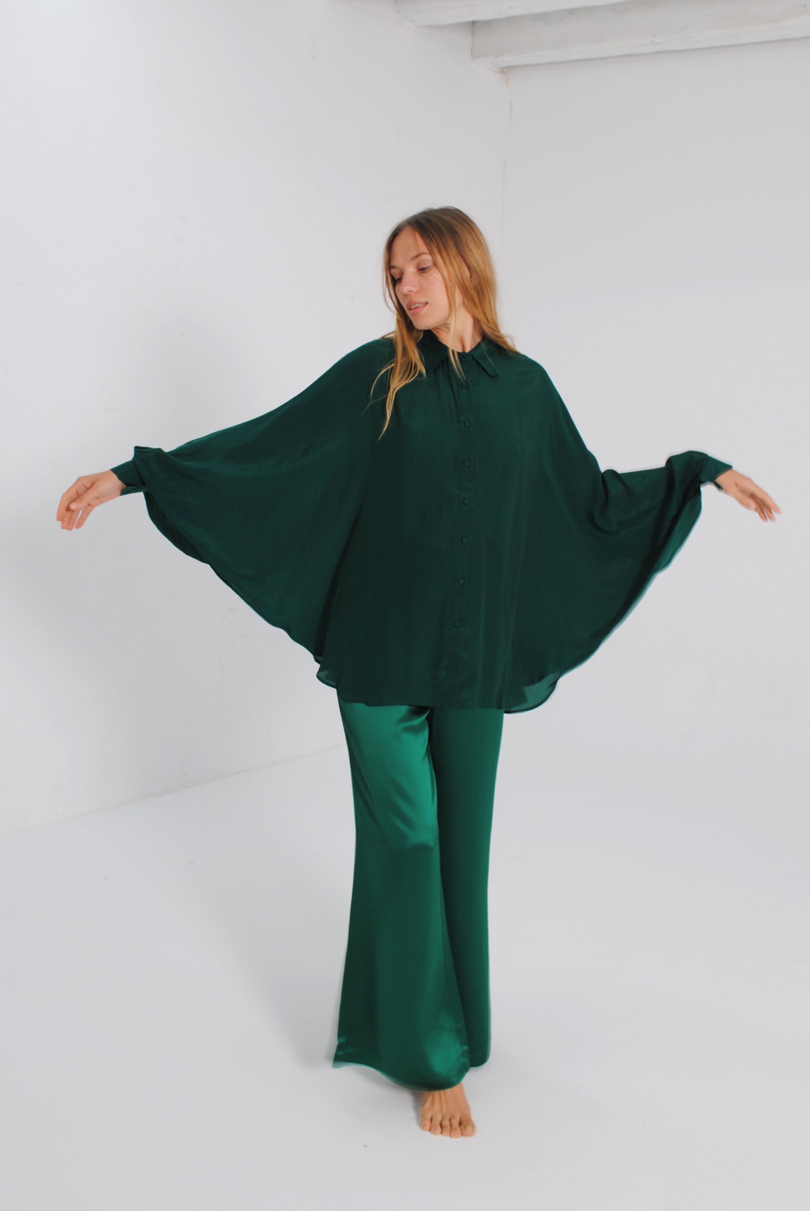 Camisa murciélago de cuello redondo con empuñadura de botón. Botonadura frontal revestida del mismo tejido que la prenda, cuello redondo y sin bolsillos.