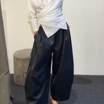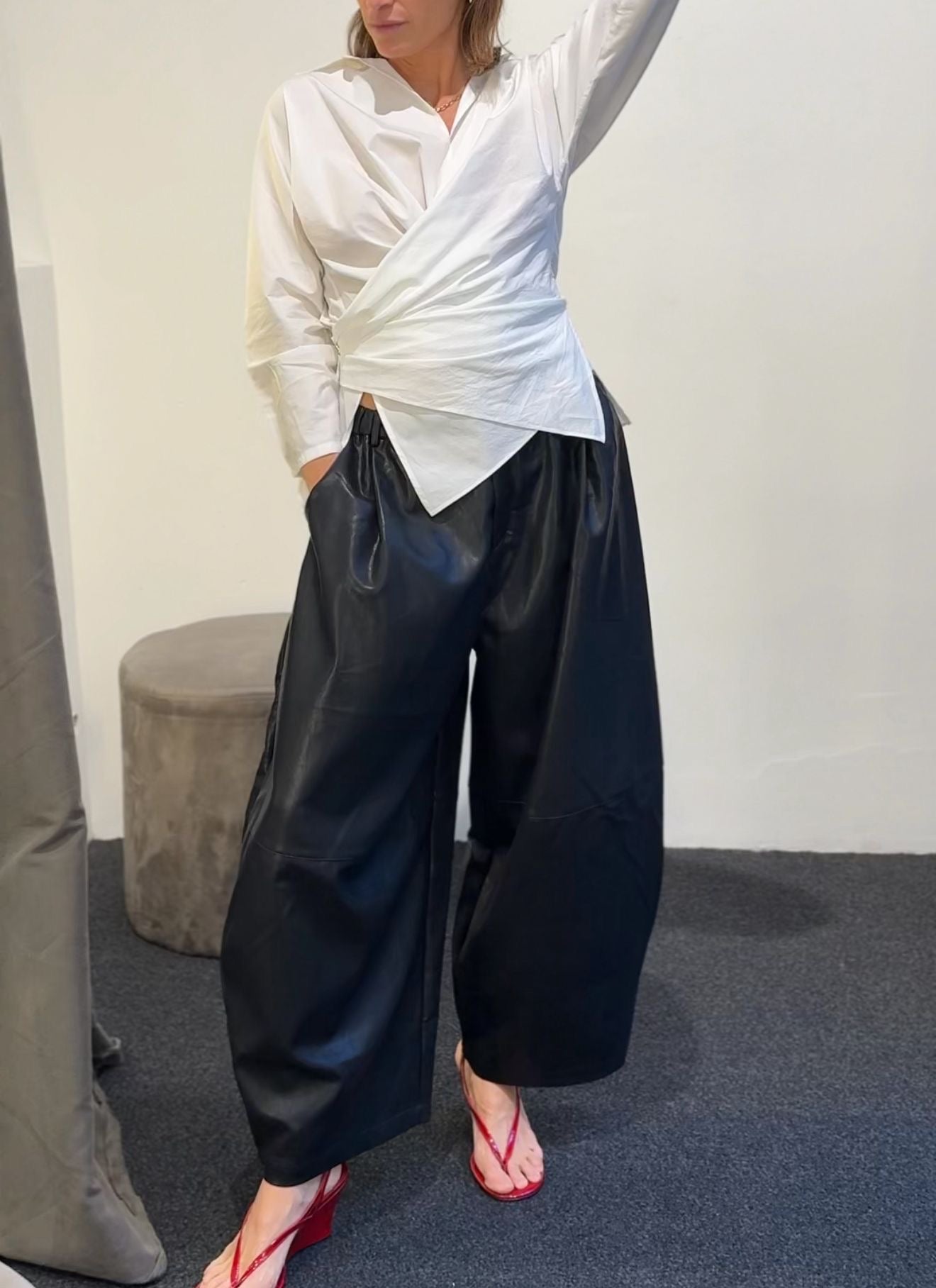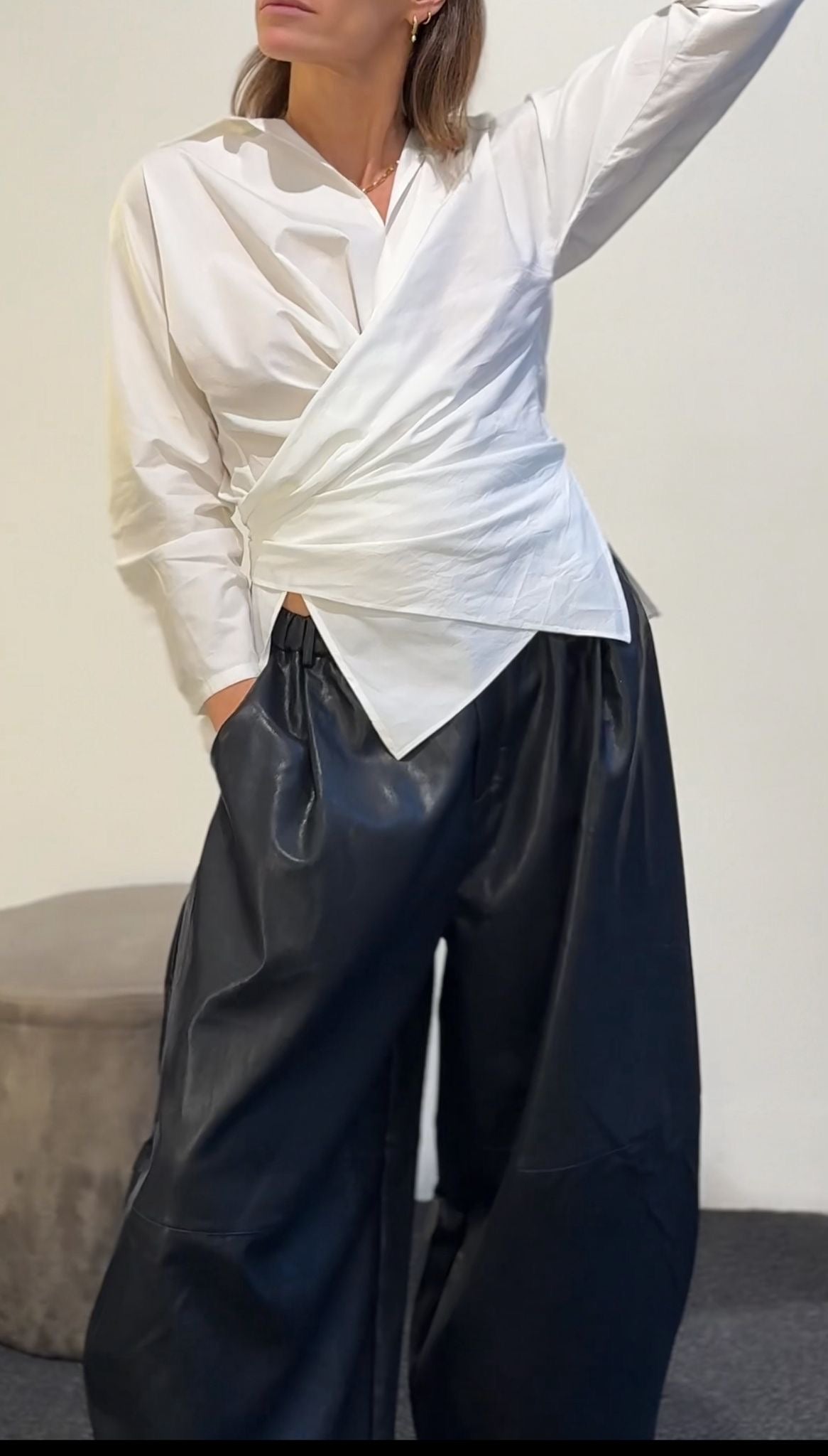 Camisa con cuello camisero, puntas frontales inferiores y corte trasero con tiras ajustables.