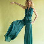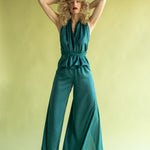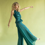 Pieza de diseño arquitectónico confeccionada en crep de viscosa. Su patrón se construye a través de dos paneles frontales que caen de forma independiente, creando un juego de aperturas y movimiento. Estos paneles se sostienen y ajustan mediante una lazada en la cintura que pasa por delante, permitiendo ceñir la silueta de manera estratégica mientras el resto de la prenda mantiene su caída fluida. Una propuesta contemporánea que redefine el concepto de top cruzado con un aire mucho más vanguardista.