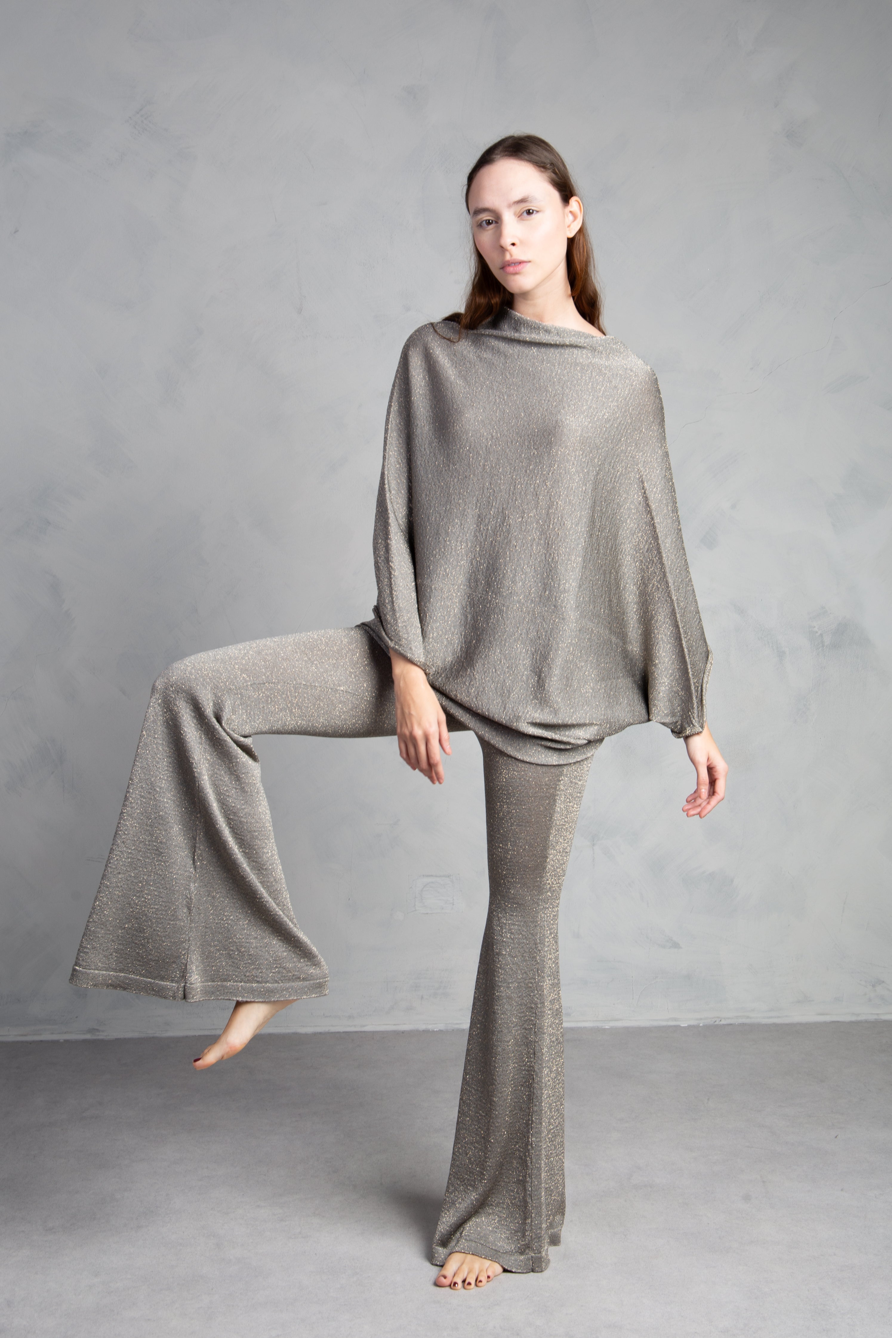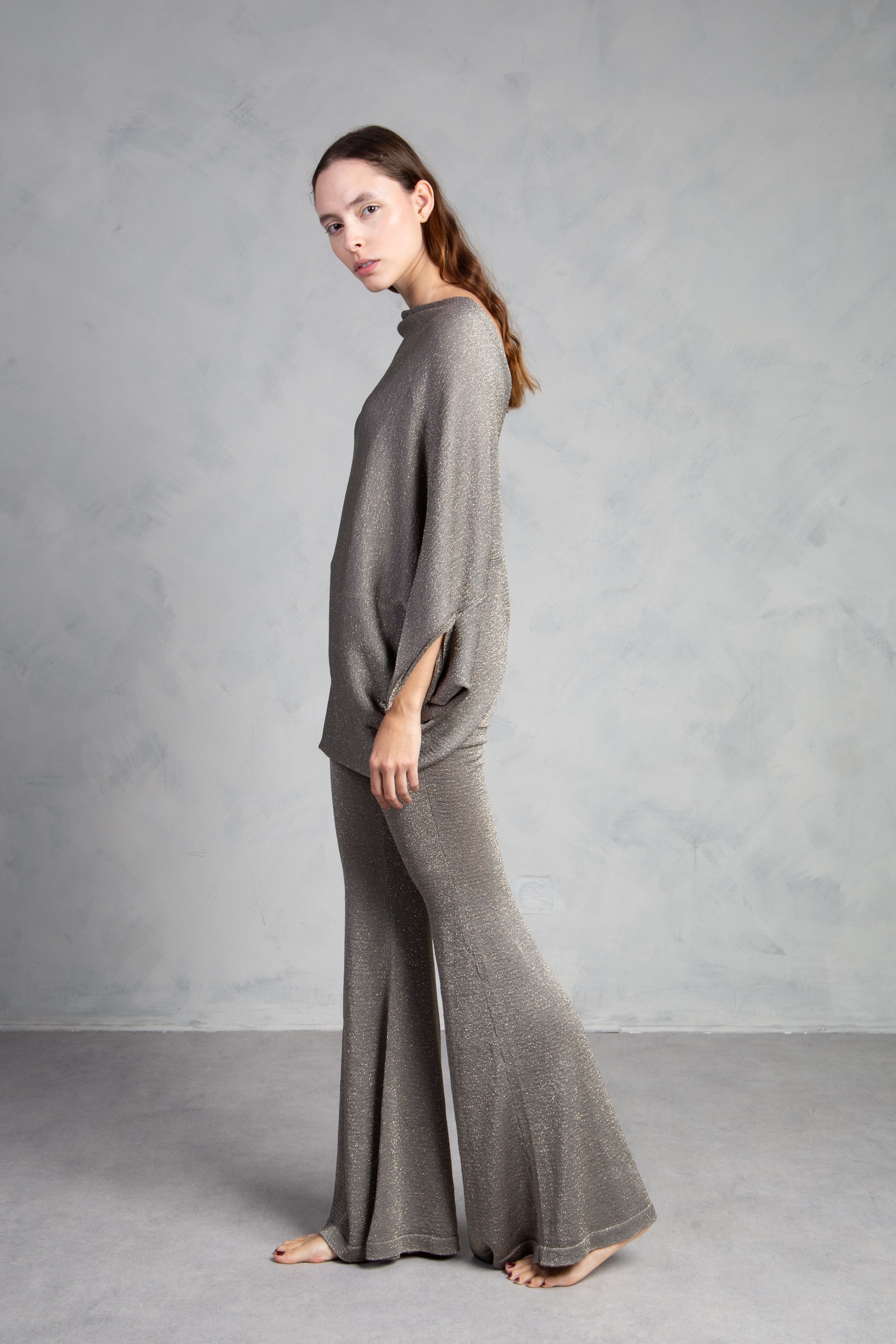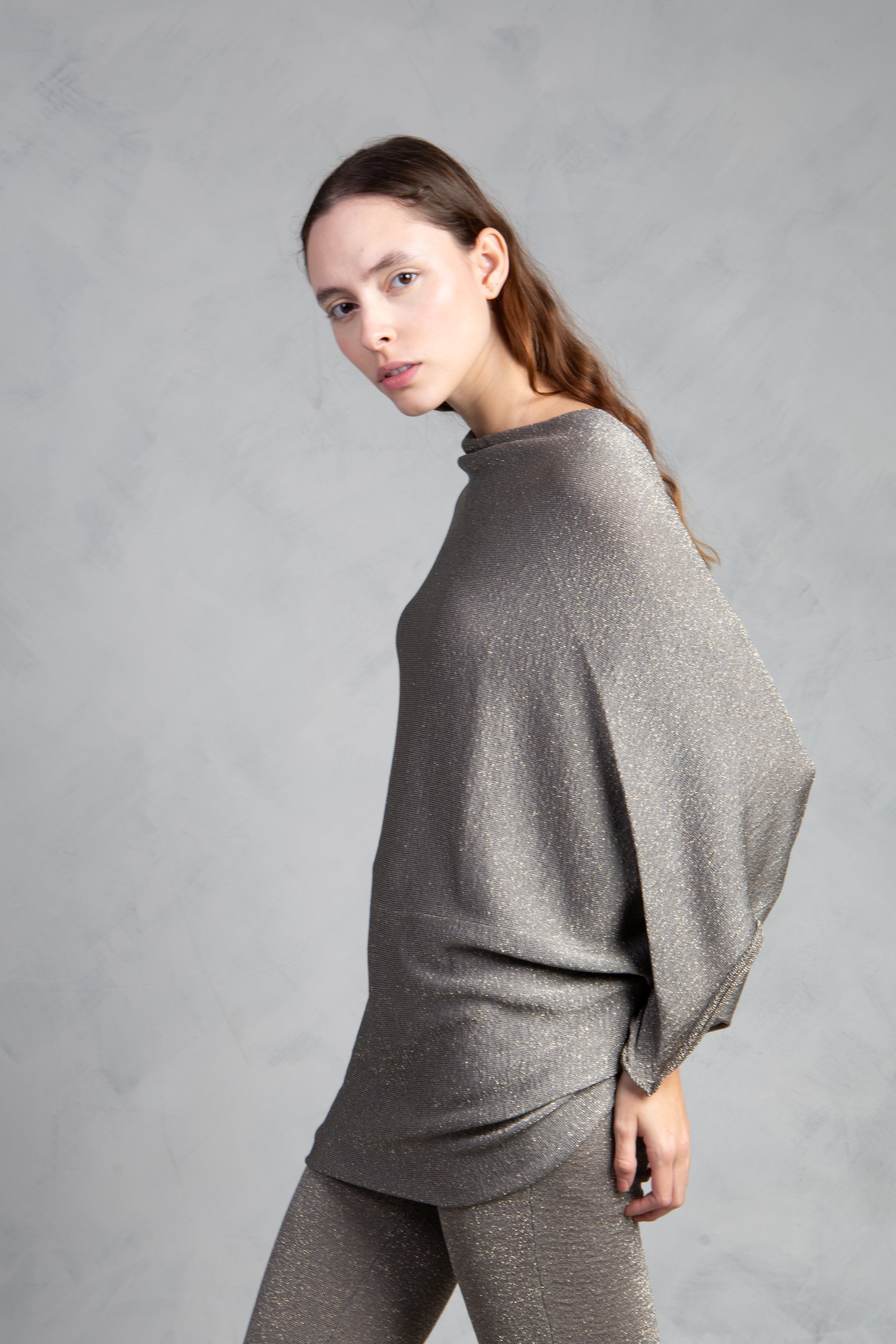 Jersey de punto con brillo, cuello redondo y manga tipo murciélago. Bajo ajustado.
