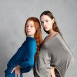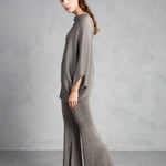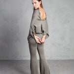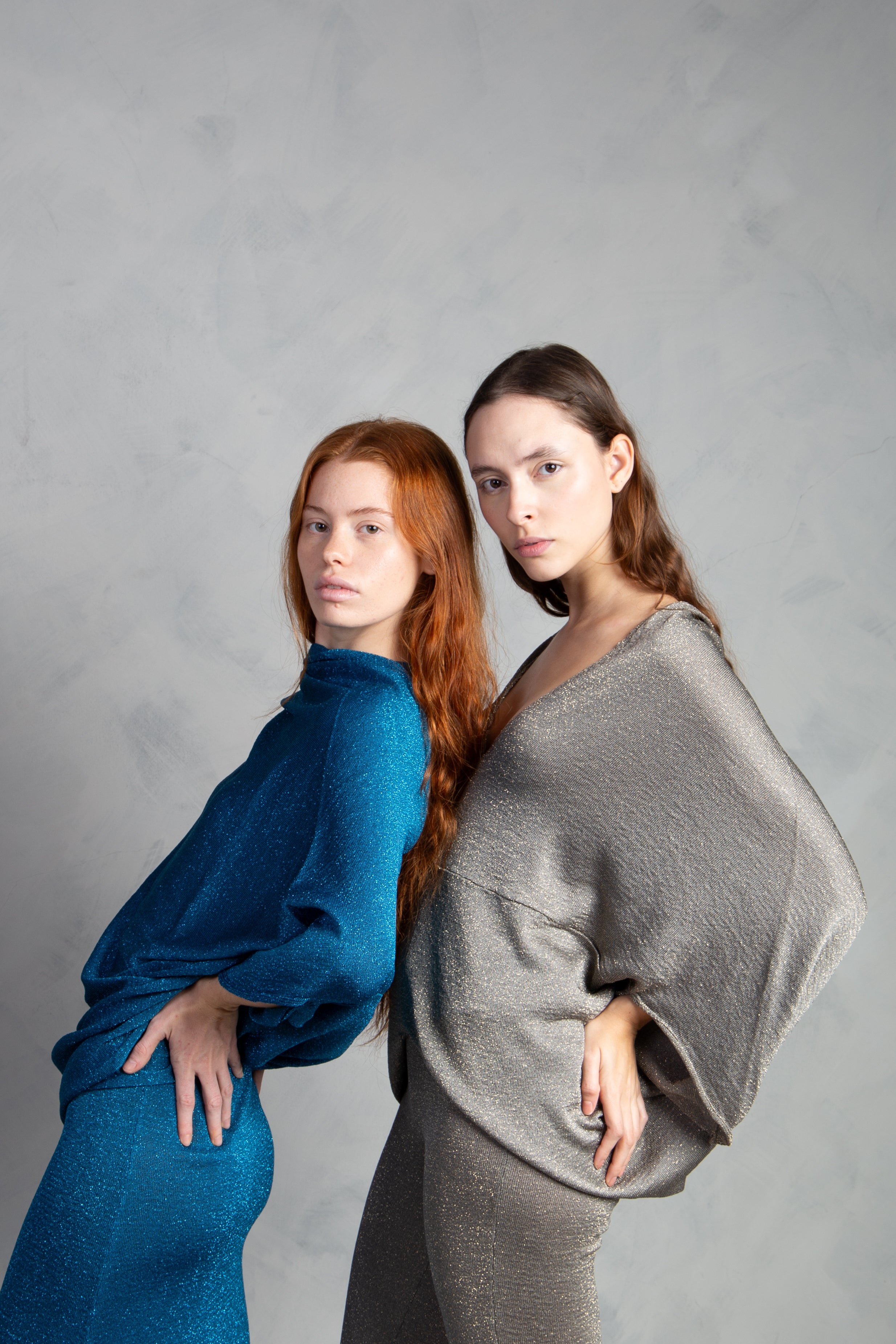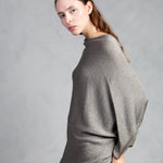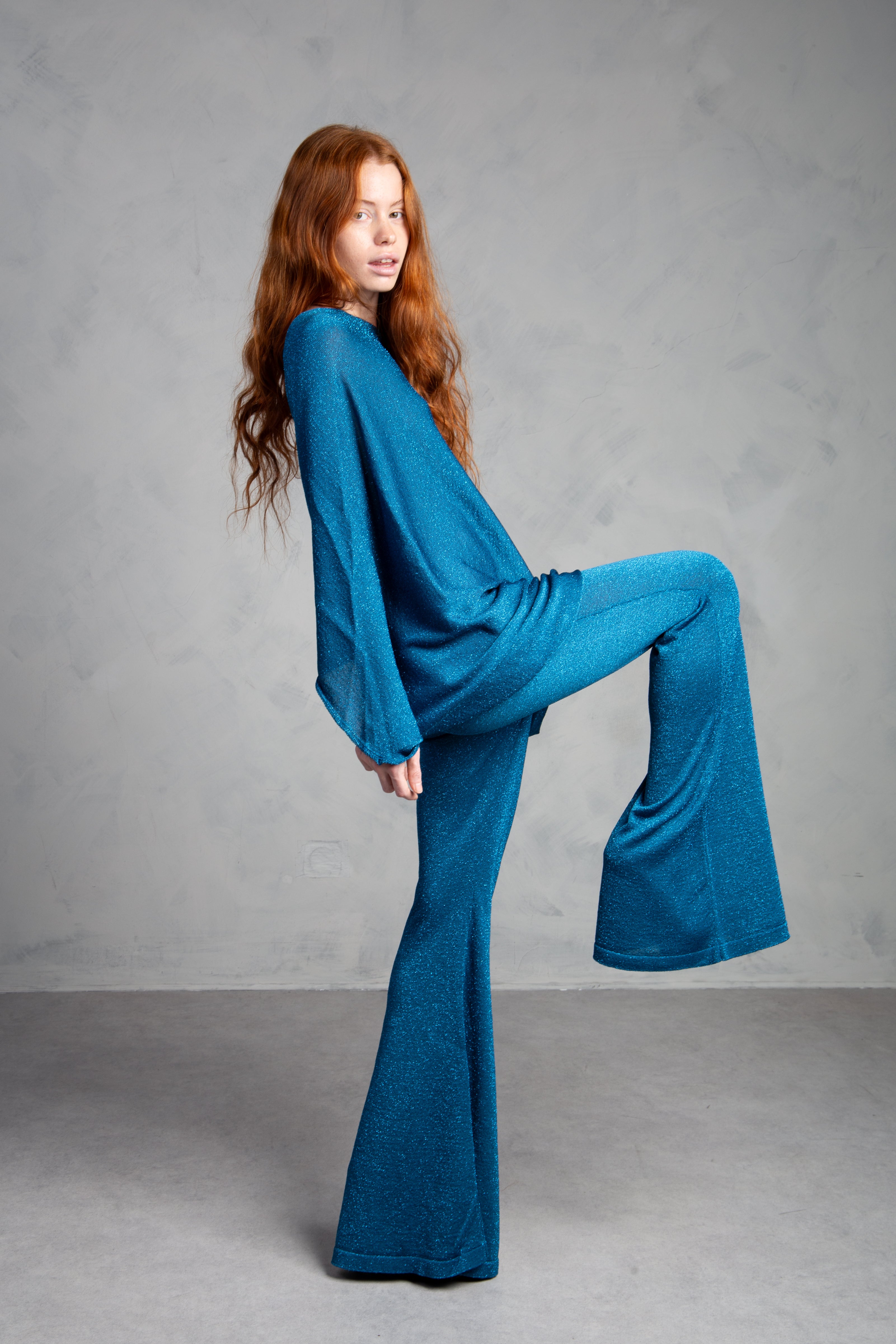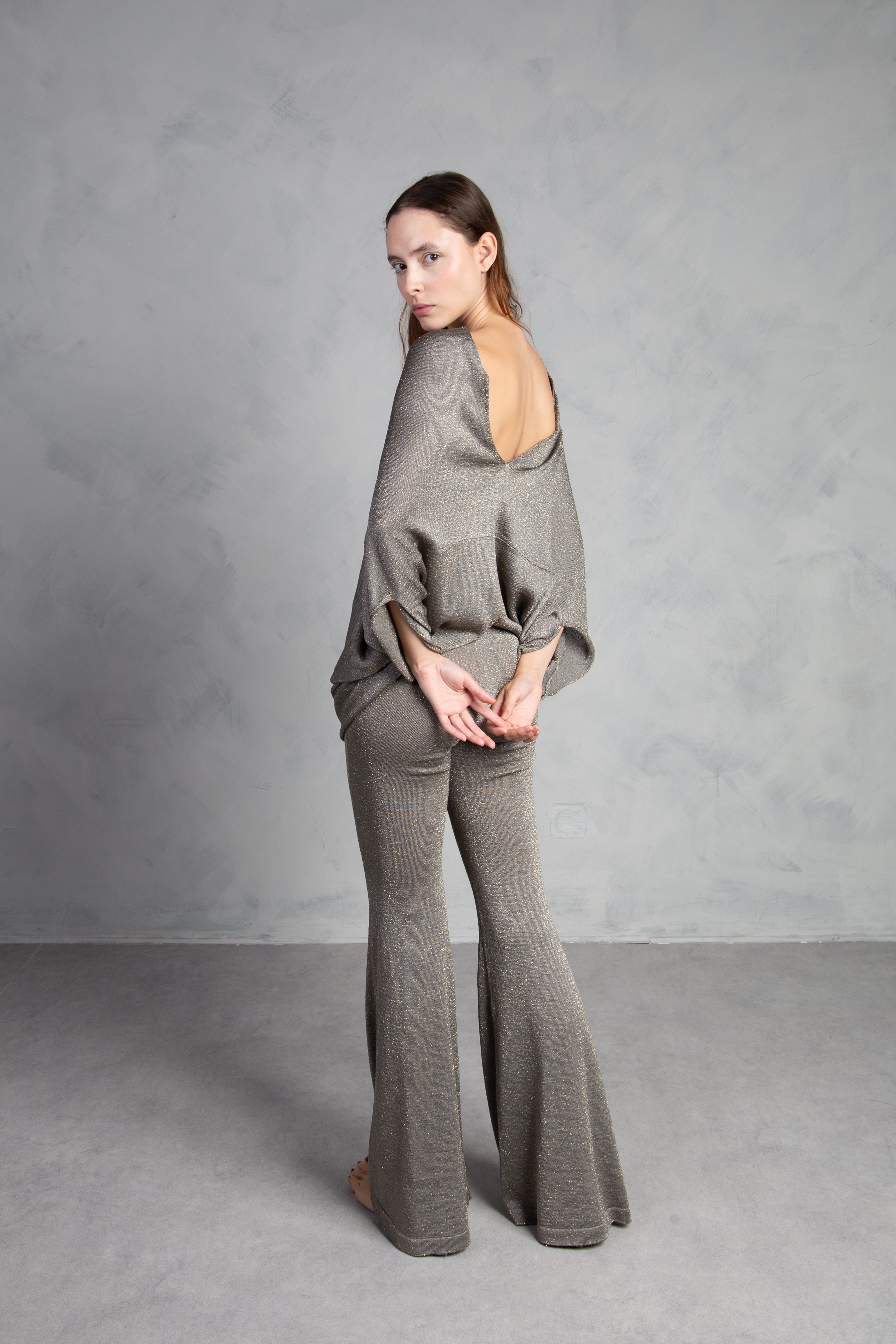 Jersey de punto con brillo, cuello redondo y manga tipo murciélago. Bajo ajustado.